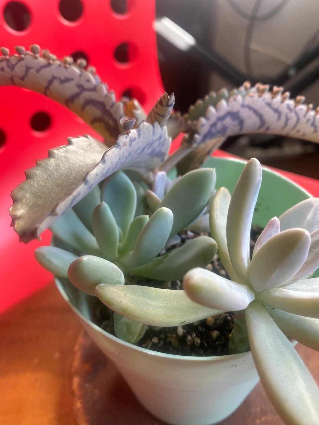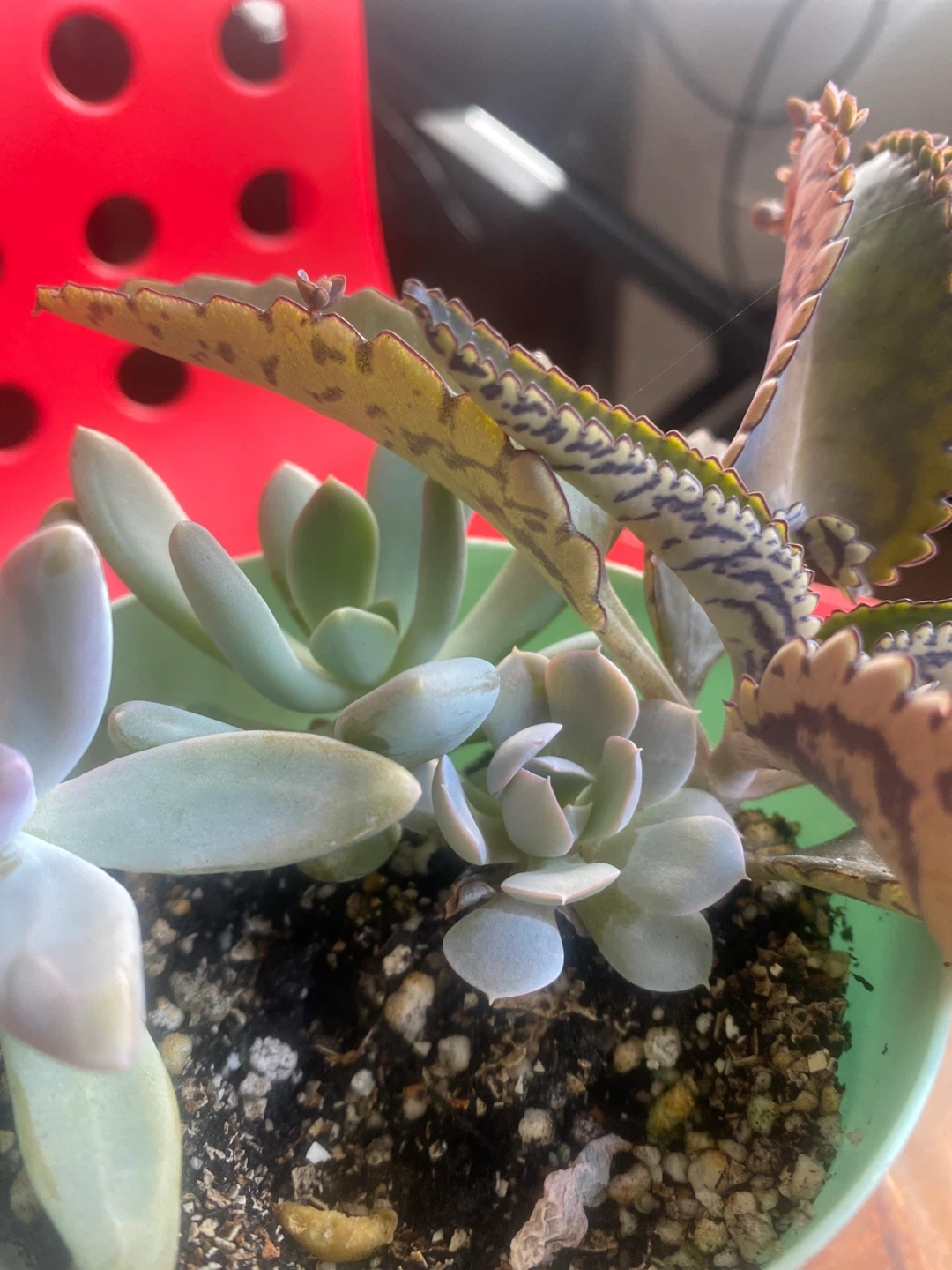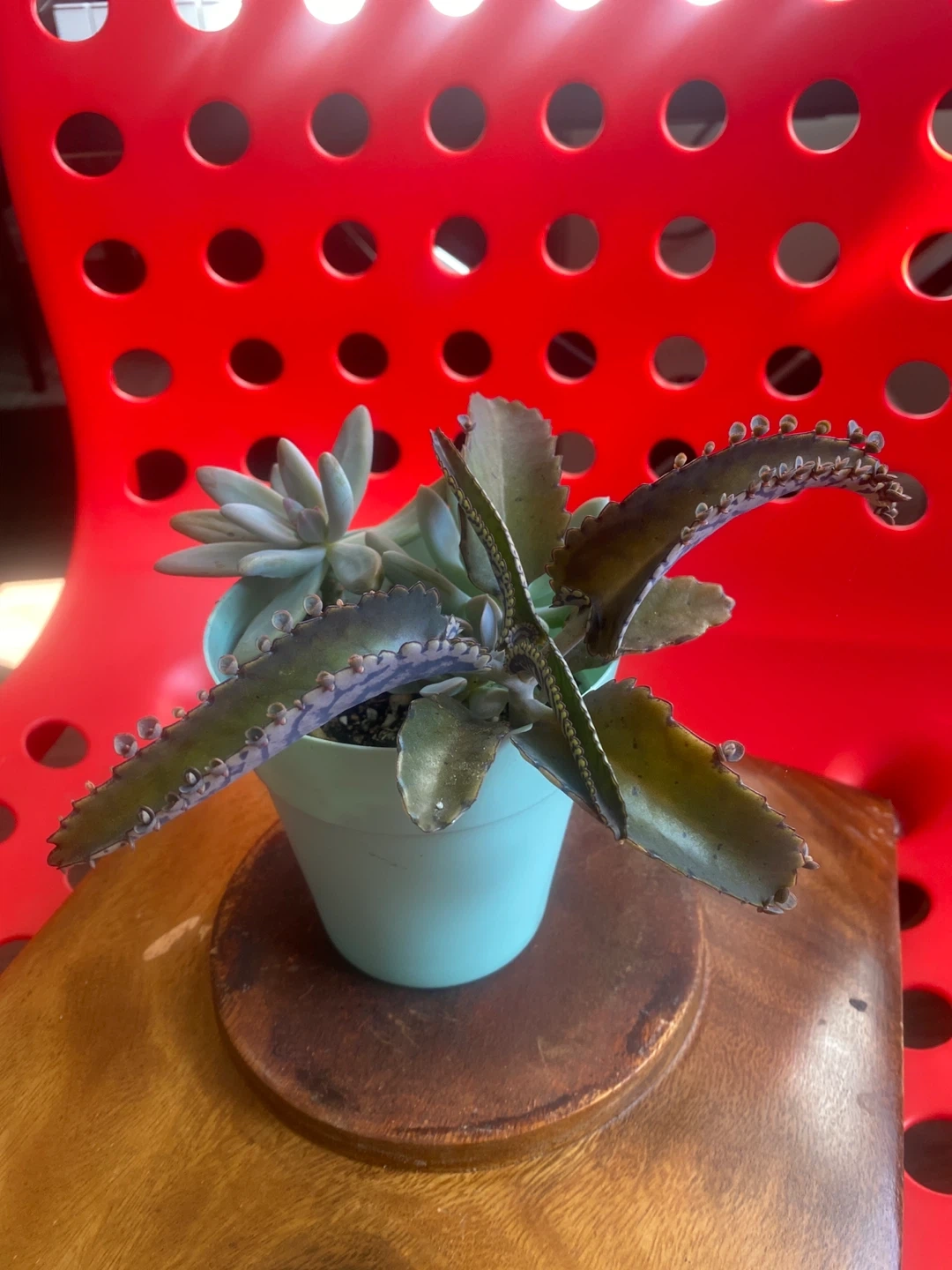 59A lovely little succulent arrangement in a light blue pot! It includes a mother of thousands plant and a ghost plant succulent. Perfect for adding a touch of greenery to your home or office. 4 different plants in a Pot.