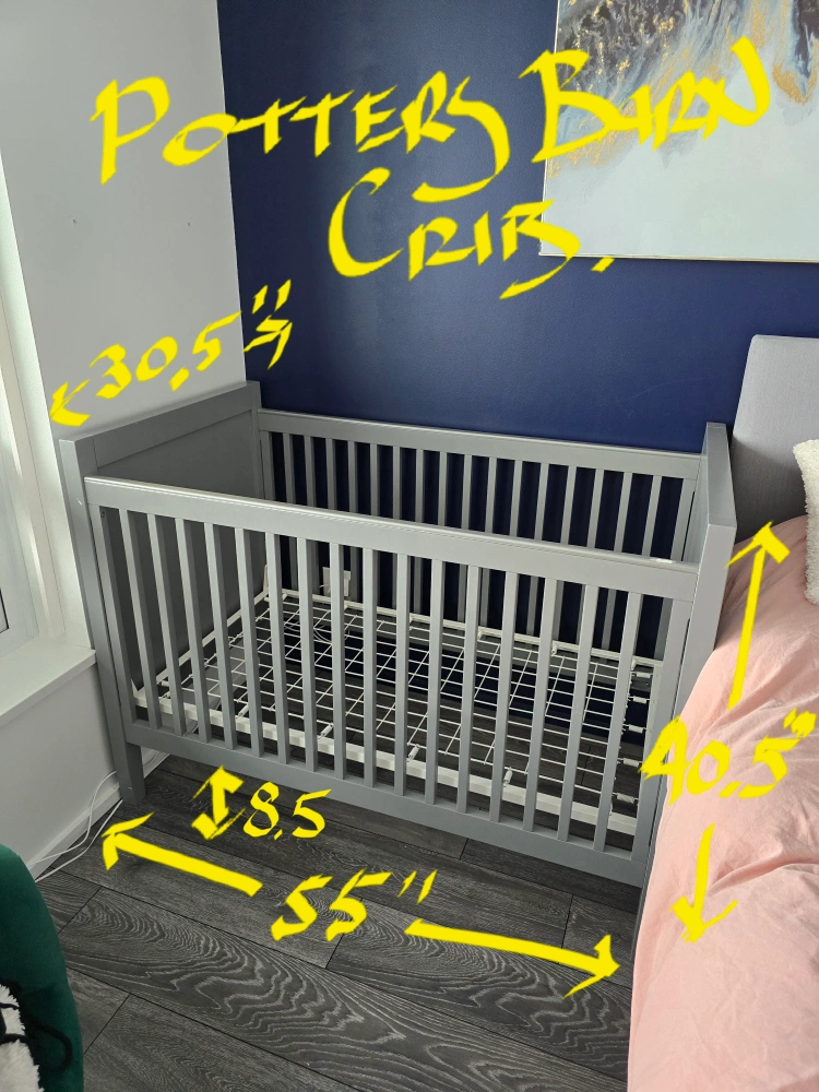 17Grey Pottery Barn crib. Good condition. Includes mattress support. Dimensions shown in image.