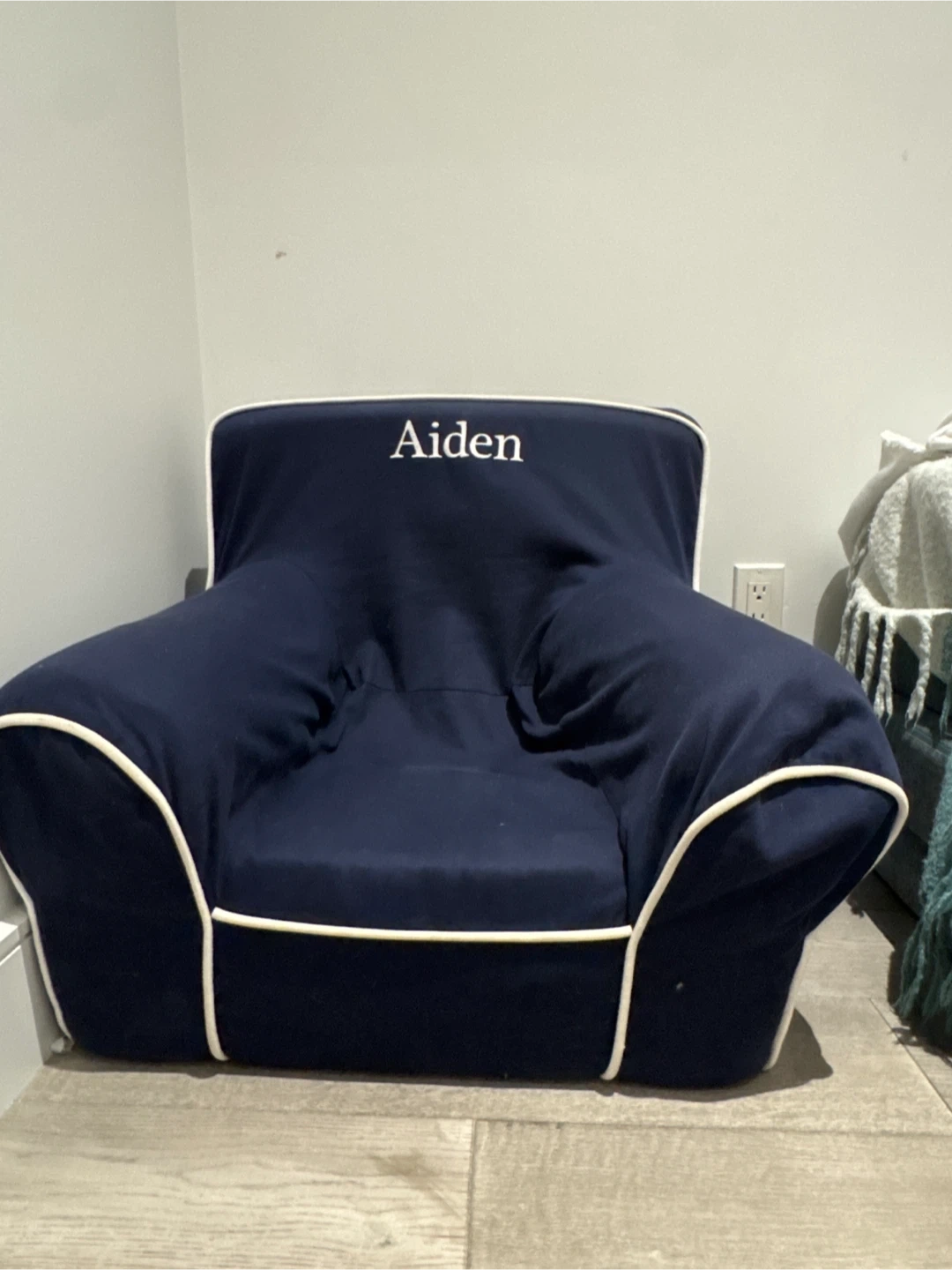 Cozy navy blue Anywhere Chair, perfect for a little one! It's in great condition and ready for a new home. The chair has the name "Aiden" embroidered on it.