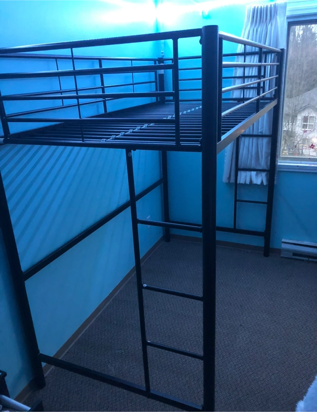 This is a black metal loft bed frame. It's sturdy and space-saving. The frame includes a ladder for easy access to the top bunk.