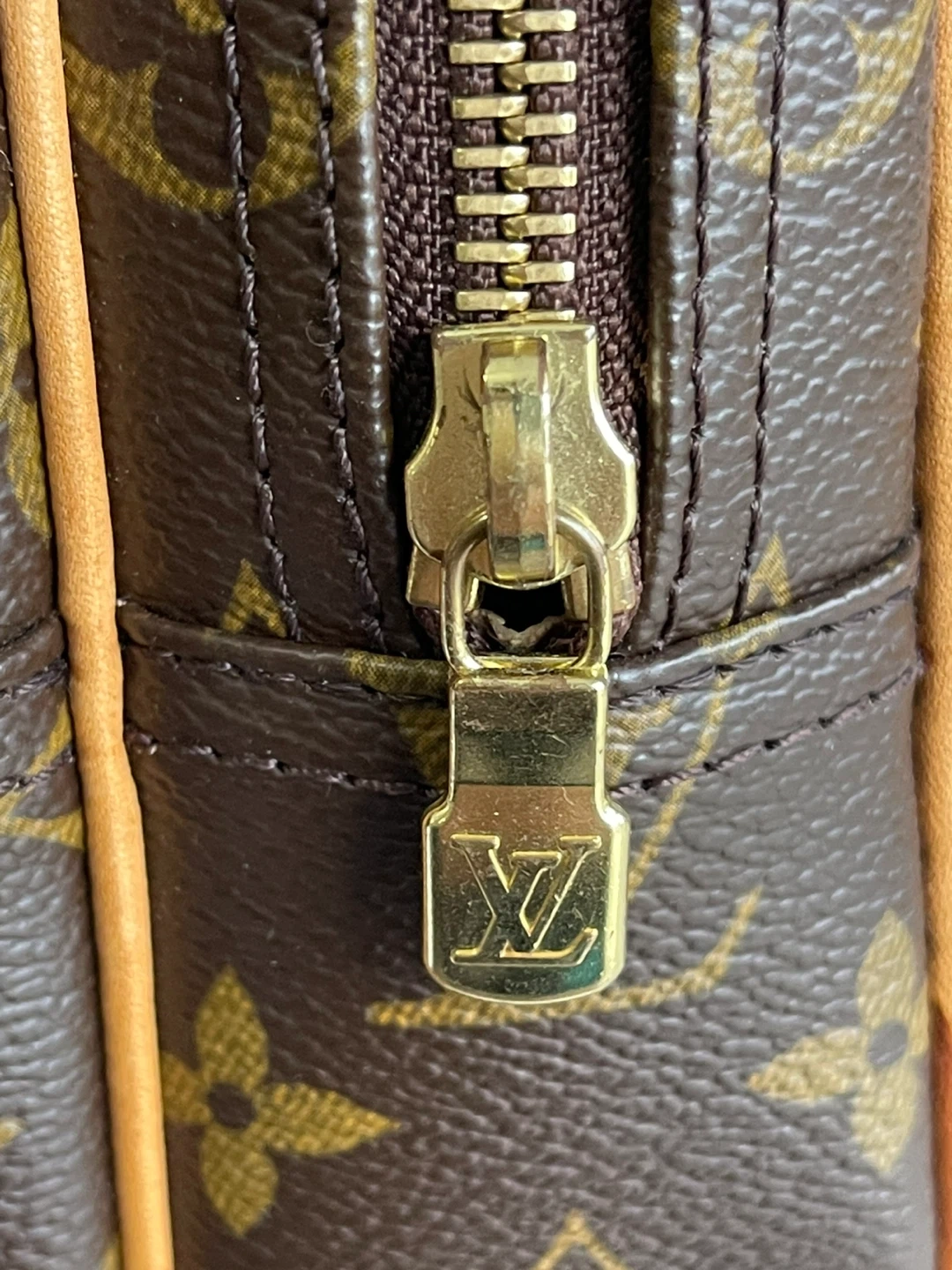 Classic Louis Vuitton monogram shoulder bag. Made in France from coated canvas and leather trim. Features a zip-top closure and adjustable strap. This stylish bag is perfect for everyday use.