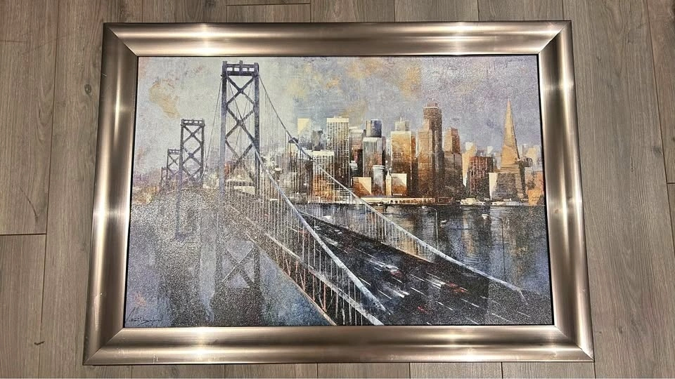 Beautiful large framed wall art featuring a city skyline with a bridge view, done in soft neutral and metallic tones. Comes in a modern brushed silver frame that adds an elegant, upscale look. Perfect statement piece for a living room, dining area, office, or hallway. Artwork and frame are in good condition with minor signs of wear consistent with normal use. Style: Modern / Urban / Contemporary. Size: 41 inches by 29 inches. Condition: Good. Ready to hang. Pickup only.