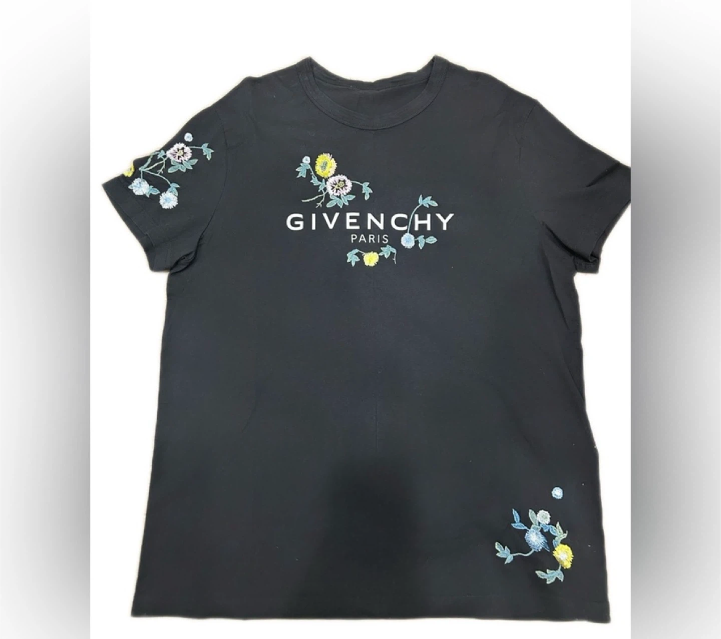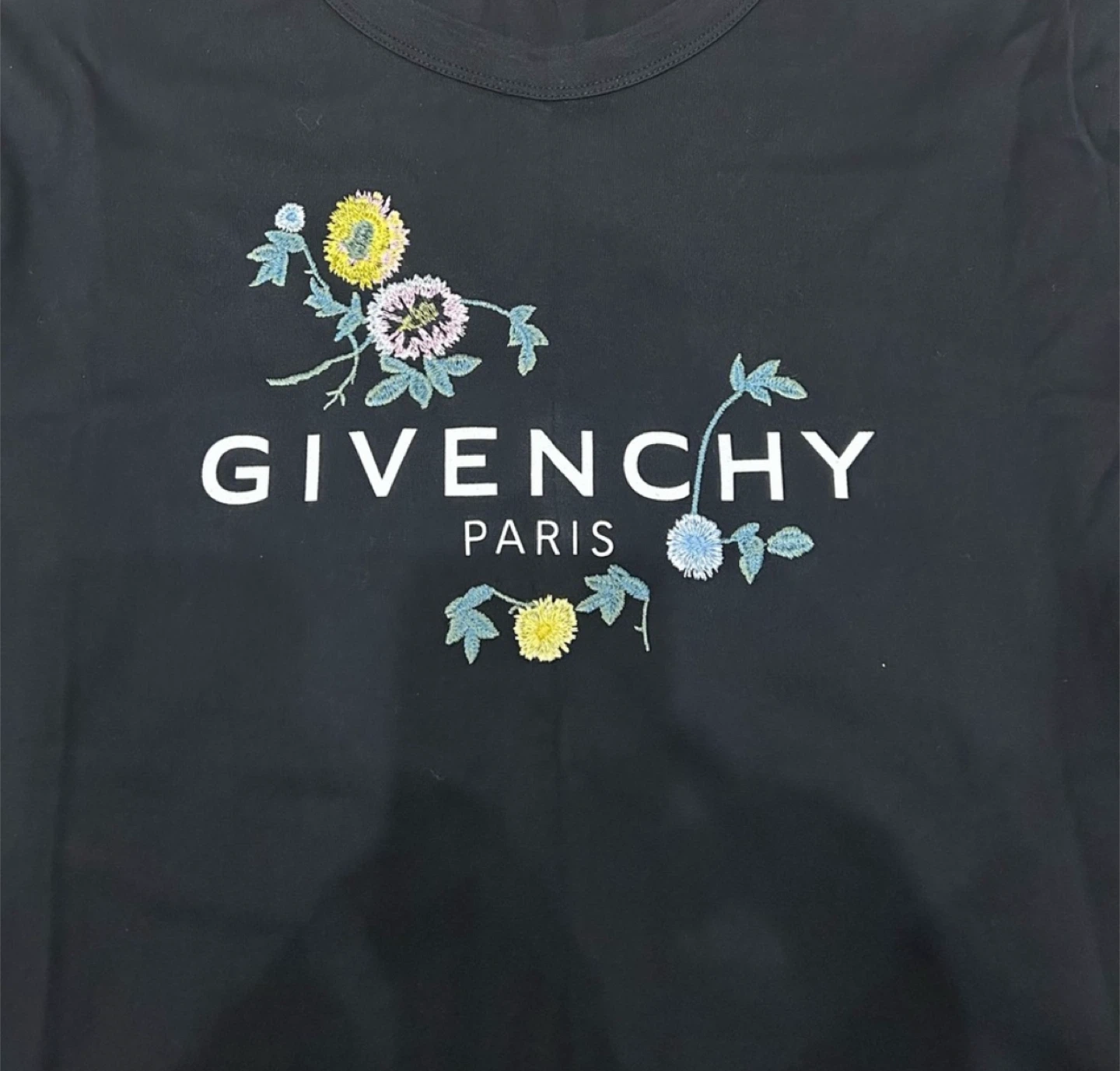 This is a black Givenchy Paris t-shirt with floral embroidery. It's made of 100% cotton fabric. The embroidery thread is 100% viscose. Size is XS.