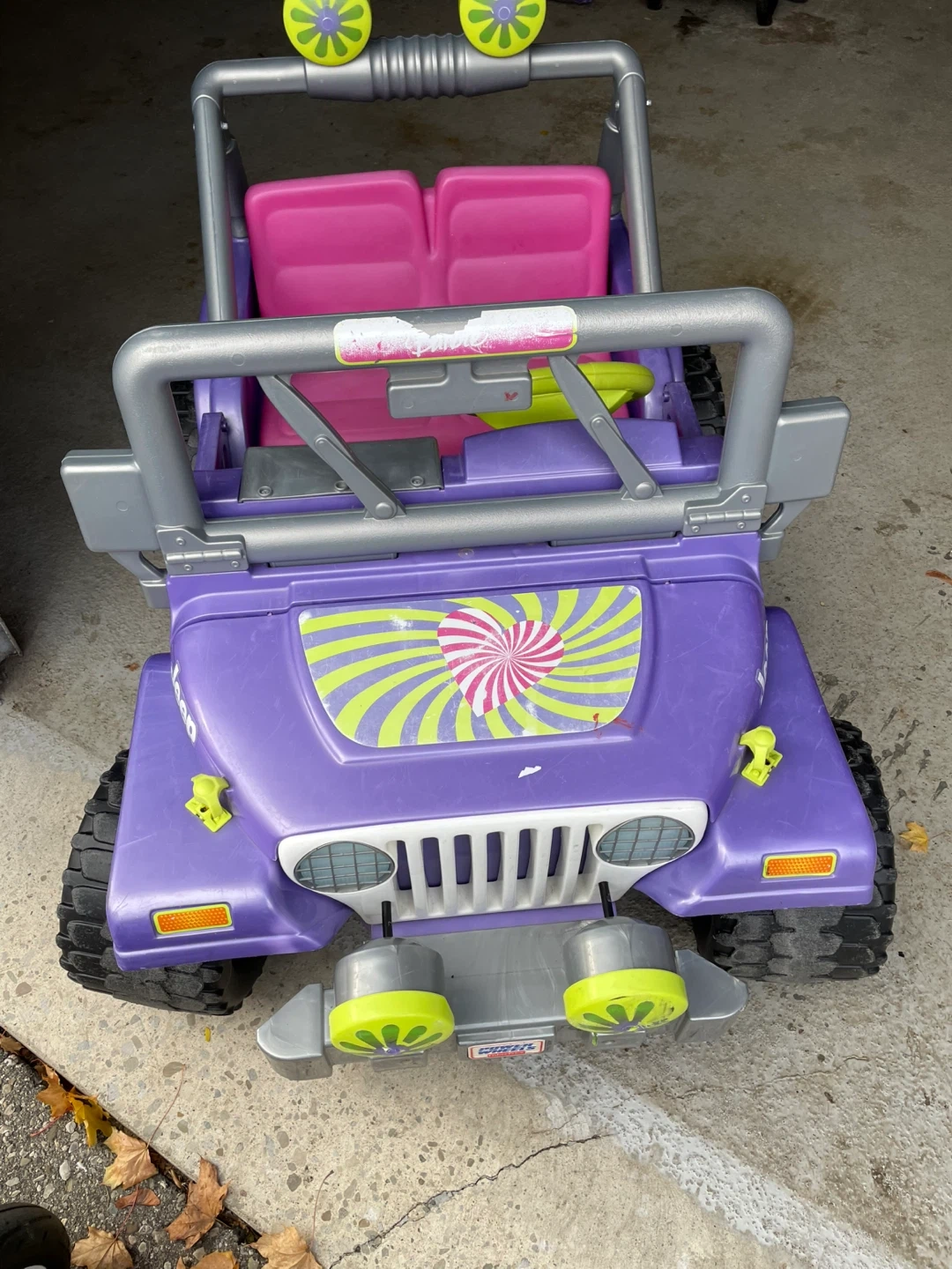 5Selling a Power Wheels Jeep ride-on toy car! It's in good condition with new battery and ready for some fun adventures. The car features a pink seat and a colourful design on the hood. Perfect for kids who love to cruise around!