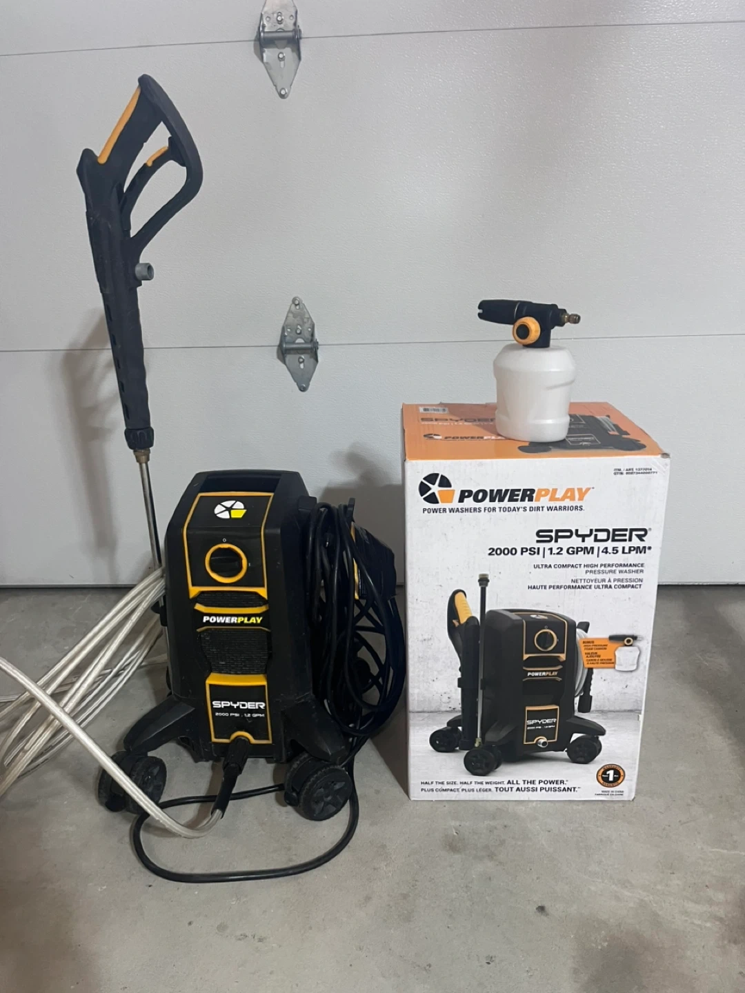 34Selling a Powerplay Spyder 2000 PSI pressure washer! It's an ultra-compact, high-performance pressure washer that's perfect for today's dirt warriors. It delivers 2000 PSI at 1.2 GPM (4.5 LPM). It's designed to be half the size and half the weight, but with all the power! Location: Morningside Ave and 401 Or Newmarket