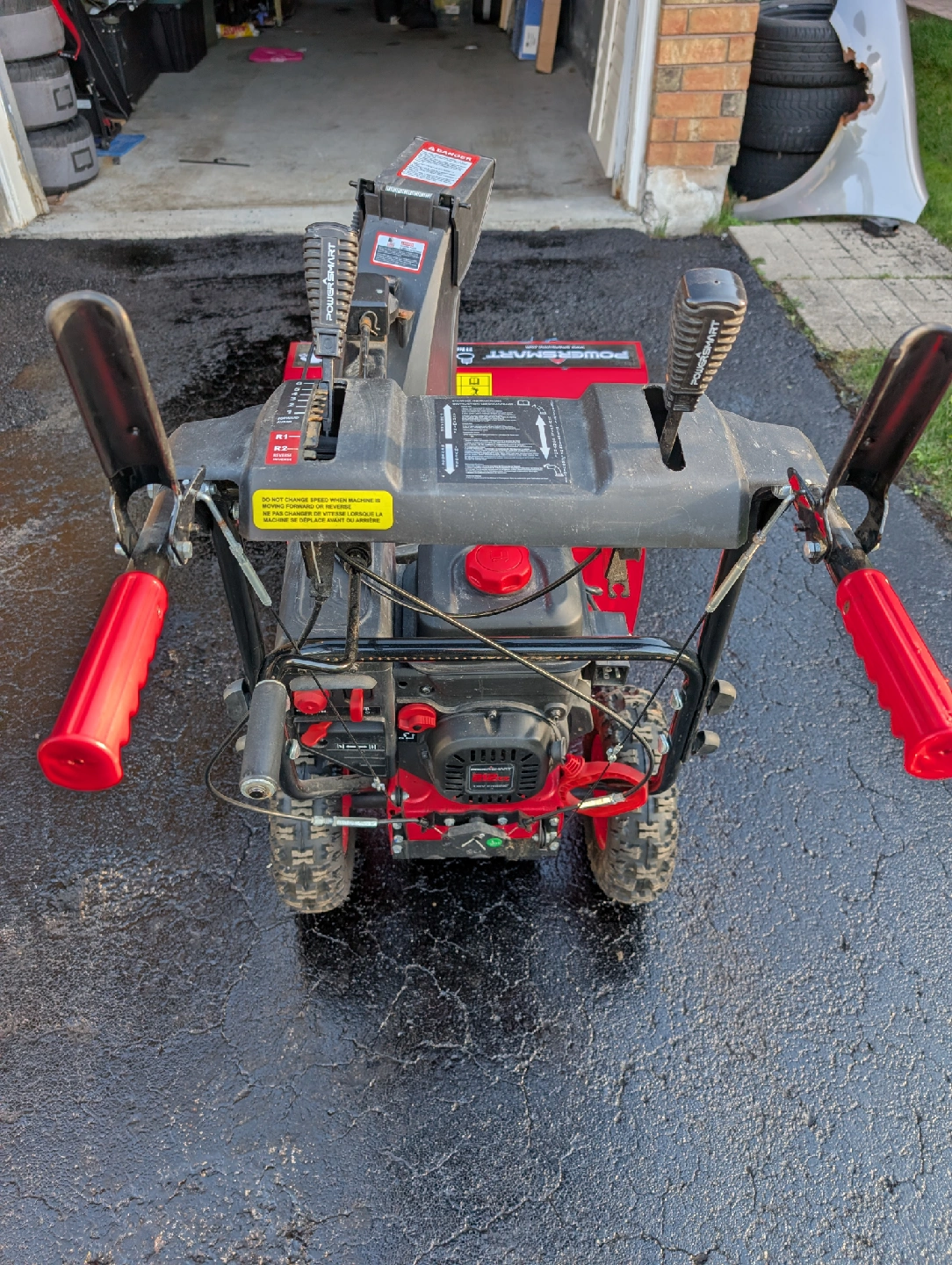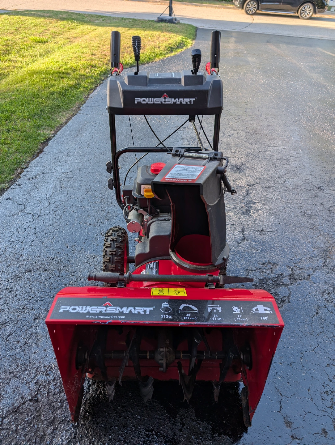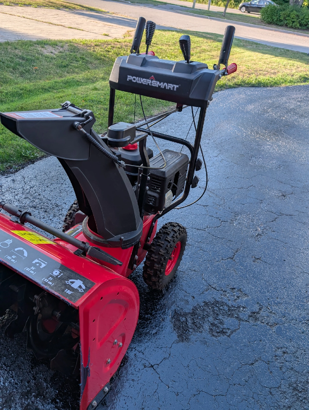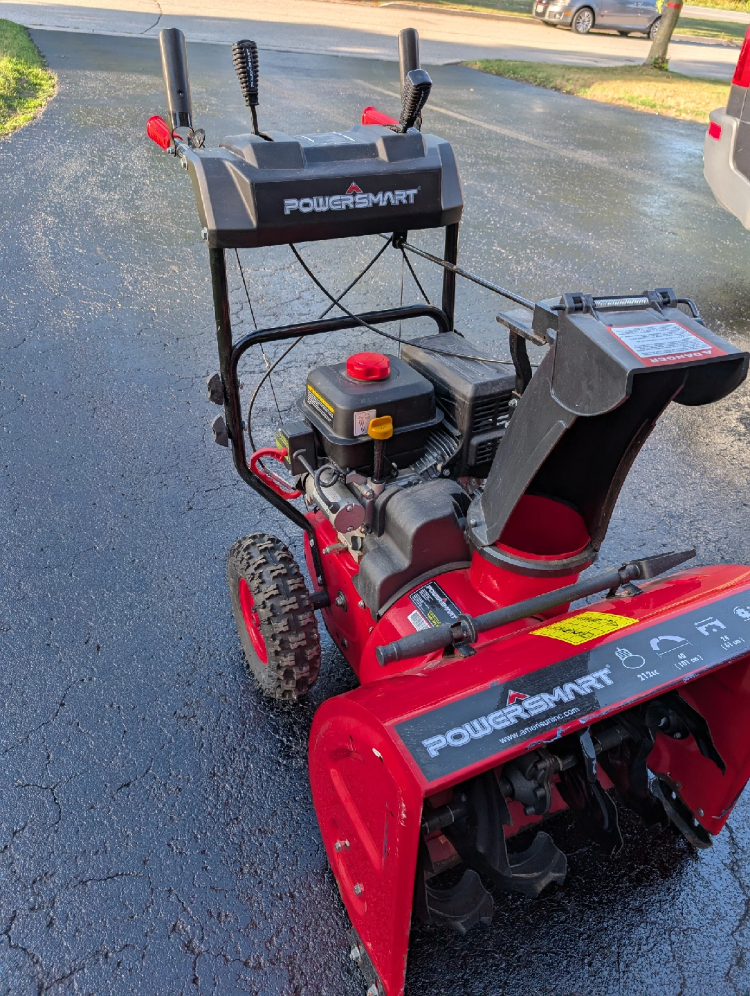 PowerSmart snow blower in great condition! This snow blower has a 212cc engine and is ready to tackle Canadian winters. It's red and black, and has a 180 degree chute rotation for easy snow removal. Perfect for clearing driveways and walkways!