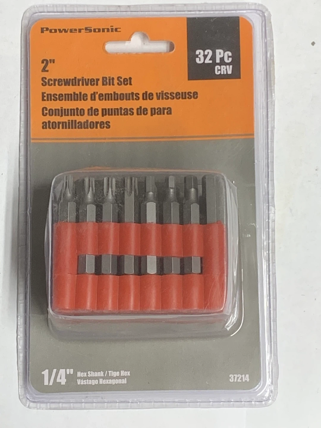 Selling a PowerSonic 2" screwdriver bit set. It includes 32 pieces and is brand new in the packaging! This set has a variety of bits including: - 5 Pc Slot - 8 Pc Square - 8 Pc Phillips - 7 Pc Torx - 4 Pc Hex Never be used. In its original packaging