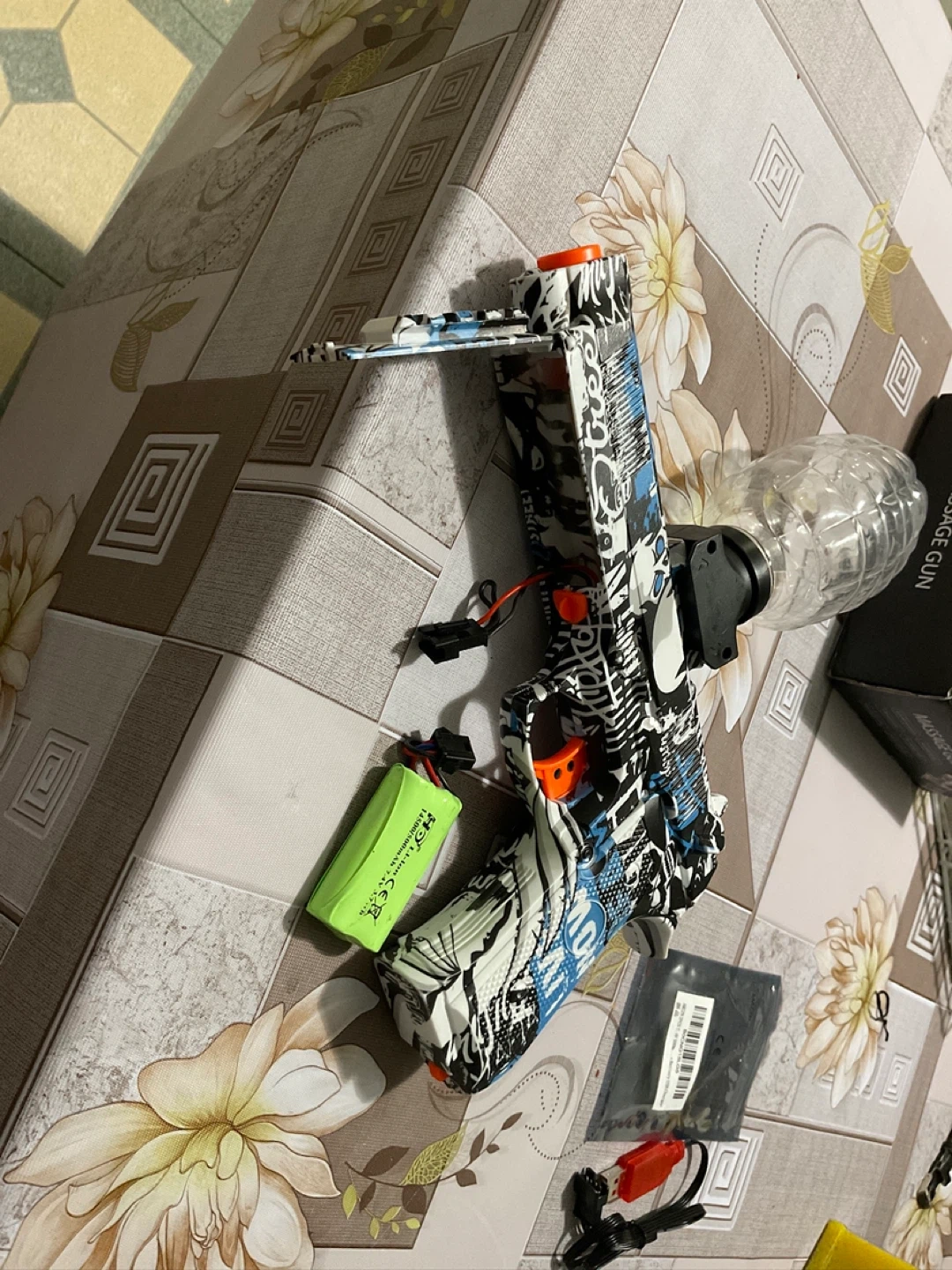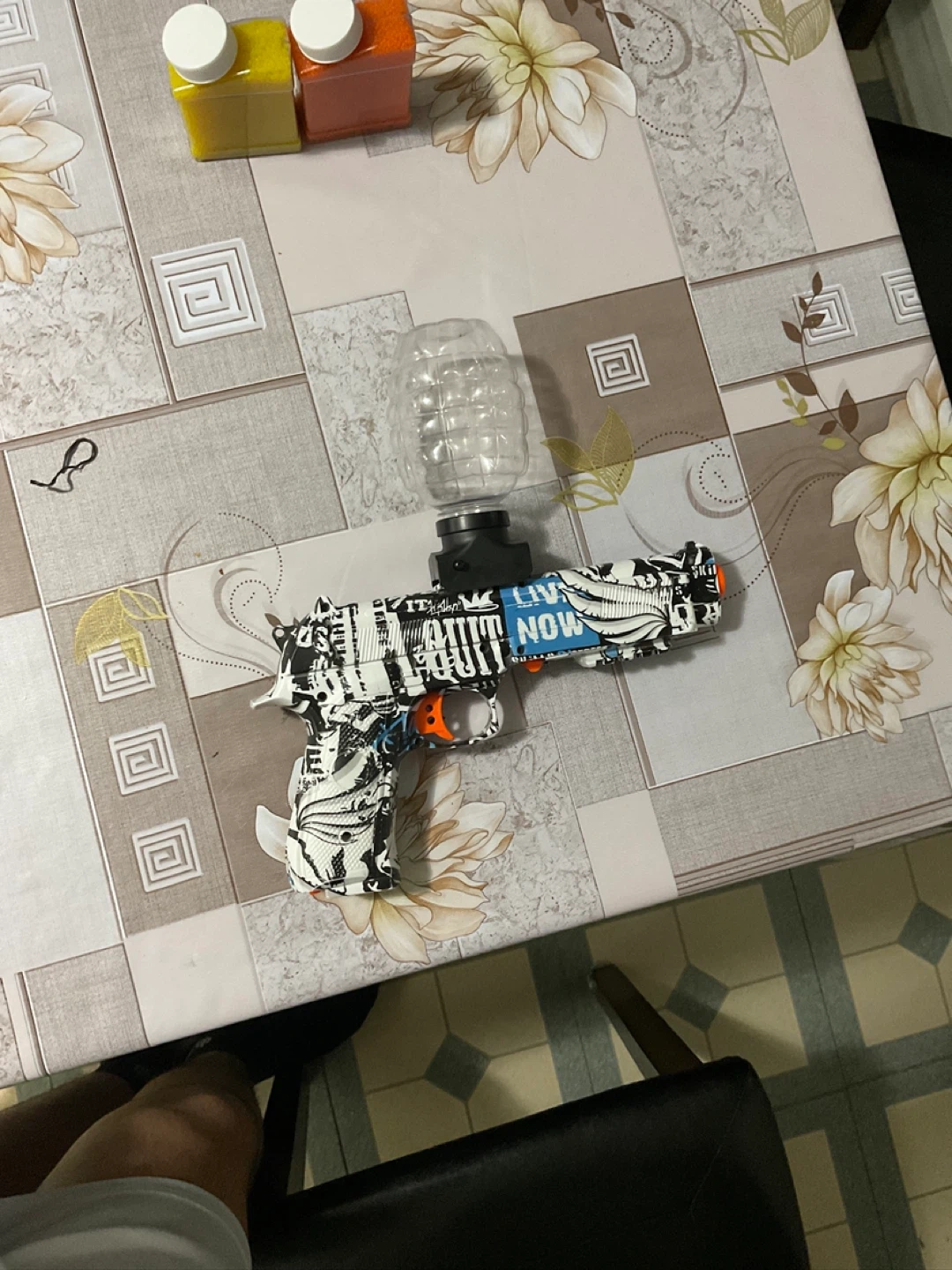 This is a gel ball blaster toy gun with a cool graphic design. It comes with gel ammo in yellow and orange, a battery, and a USB charging cable. Pickup only.