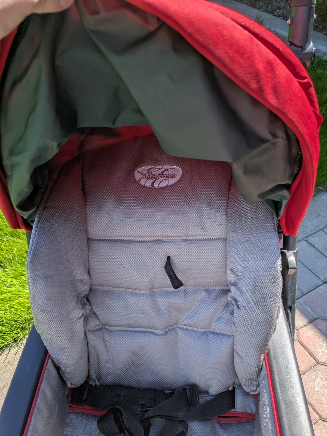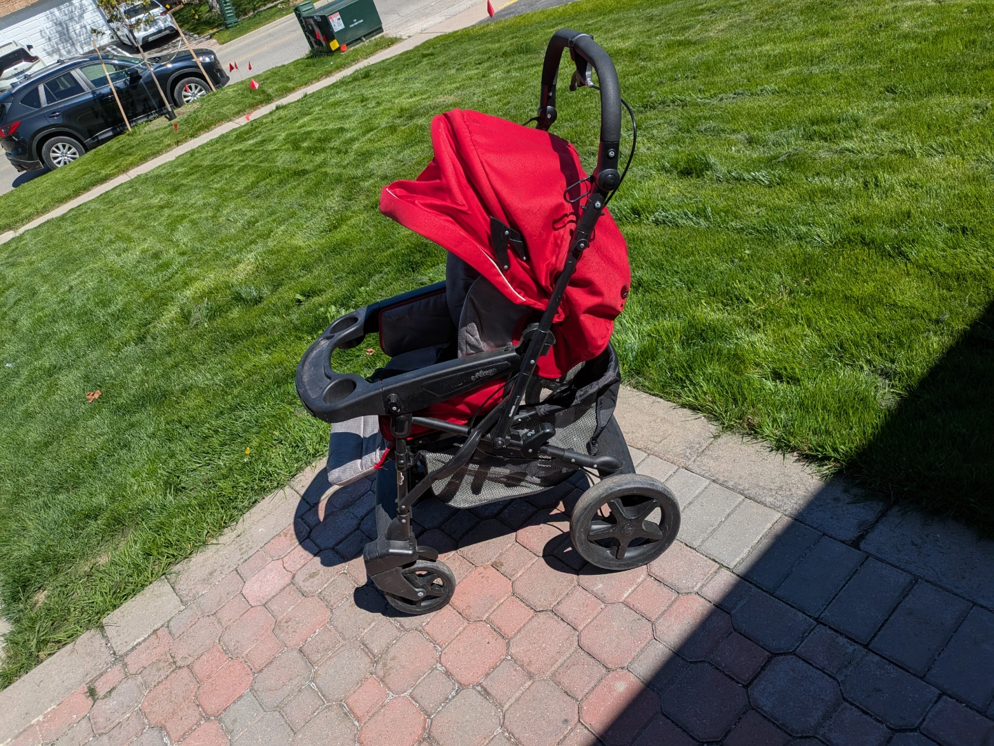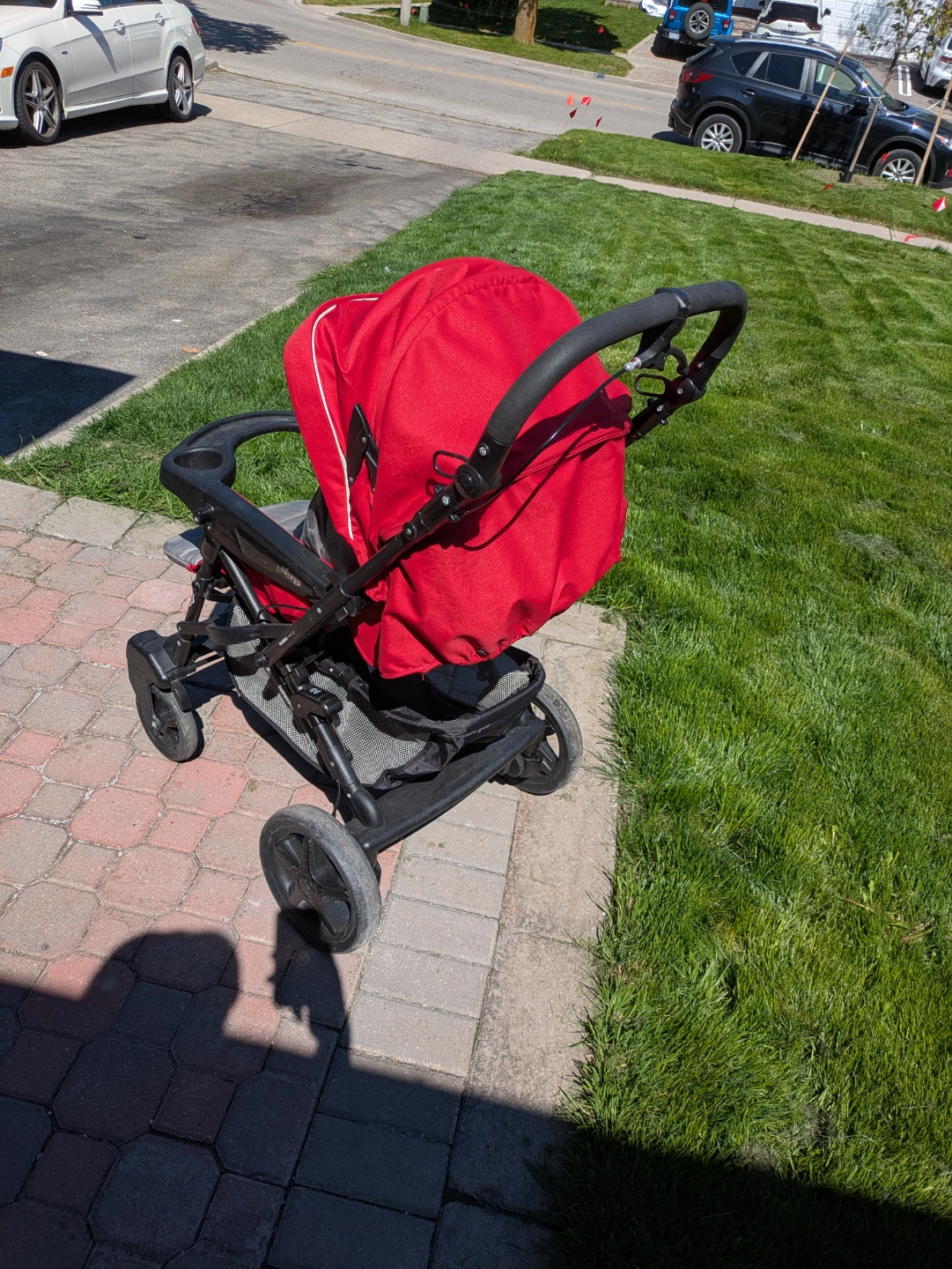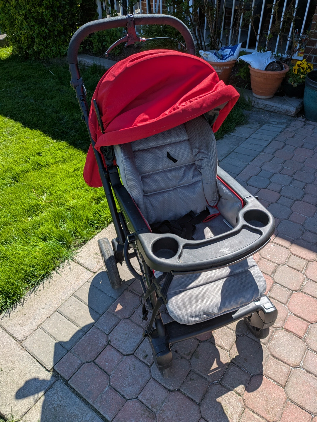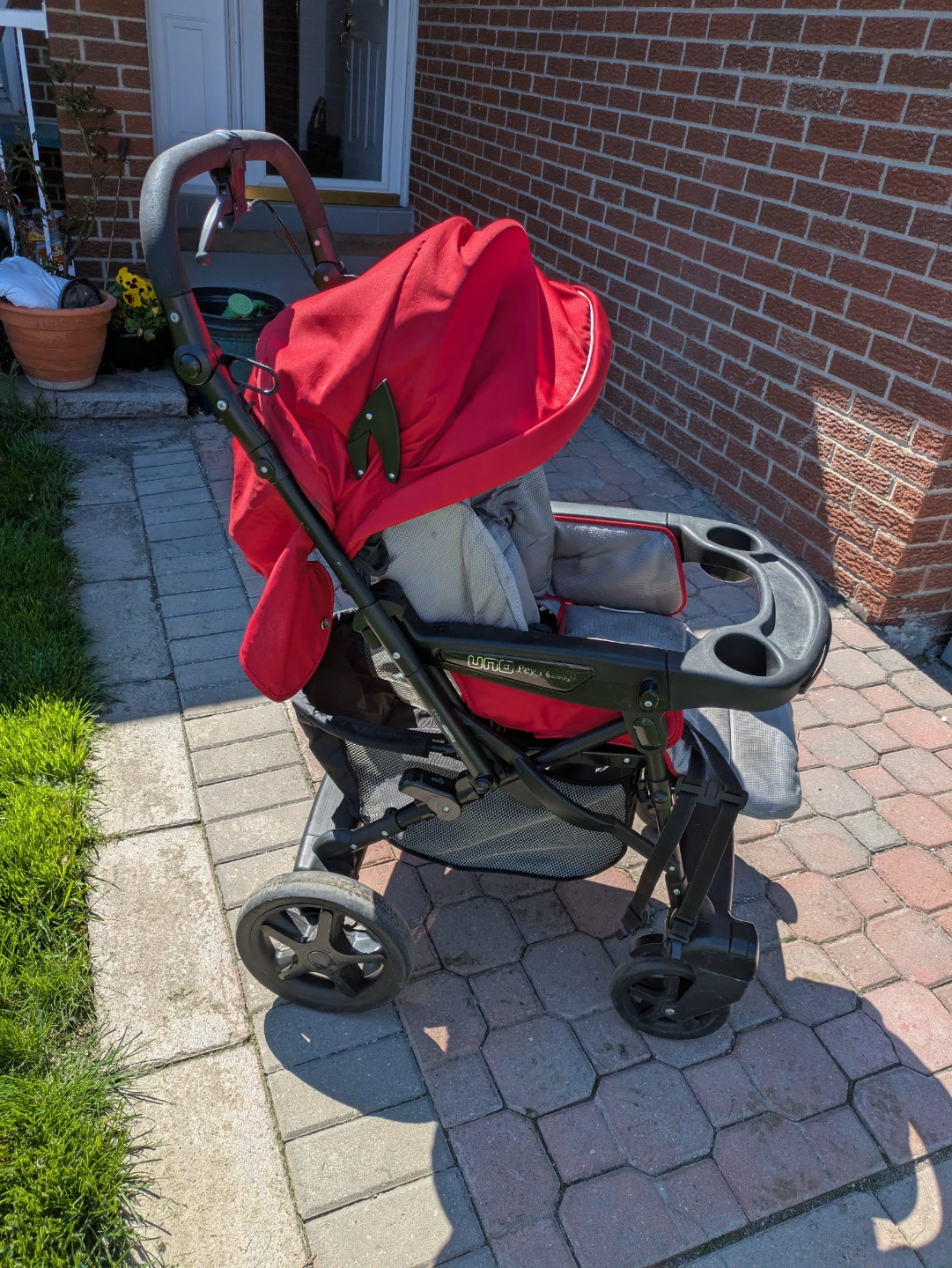 Used baby stroller. Red canopy and grey seat. Features cup holders and storage basket. Good condition. used and purchased in 2014-2016. has been in storage ever since