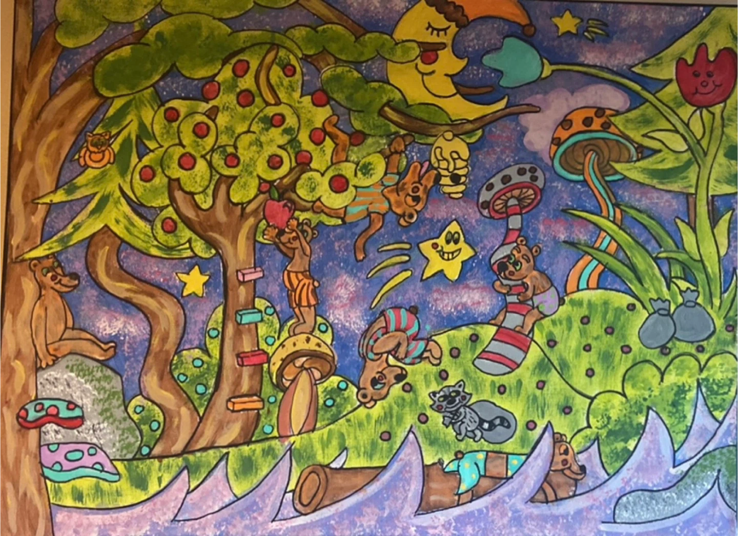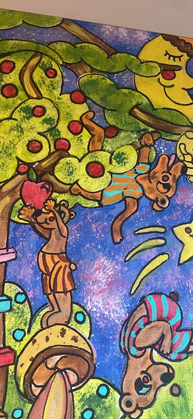 A whimsical canvas print featuring cartoon bears, a smiling moon, and colourful mushrooms. It's a vibrant piece perfect for a child's room! The art depicts a playful scene with apples on a tree and animals by the water.