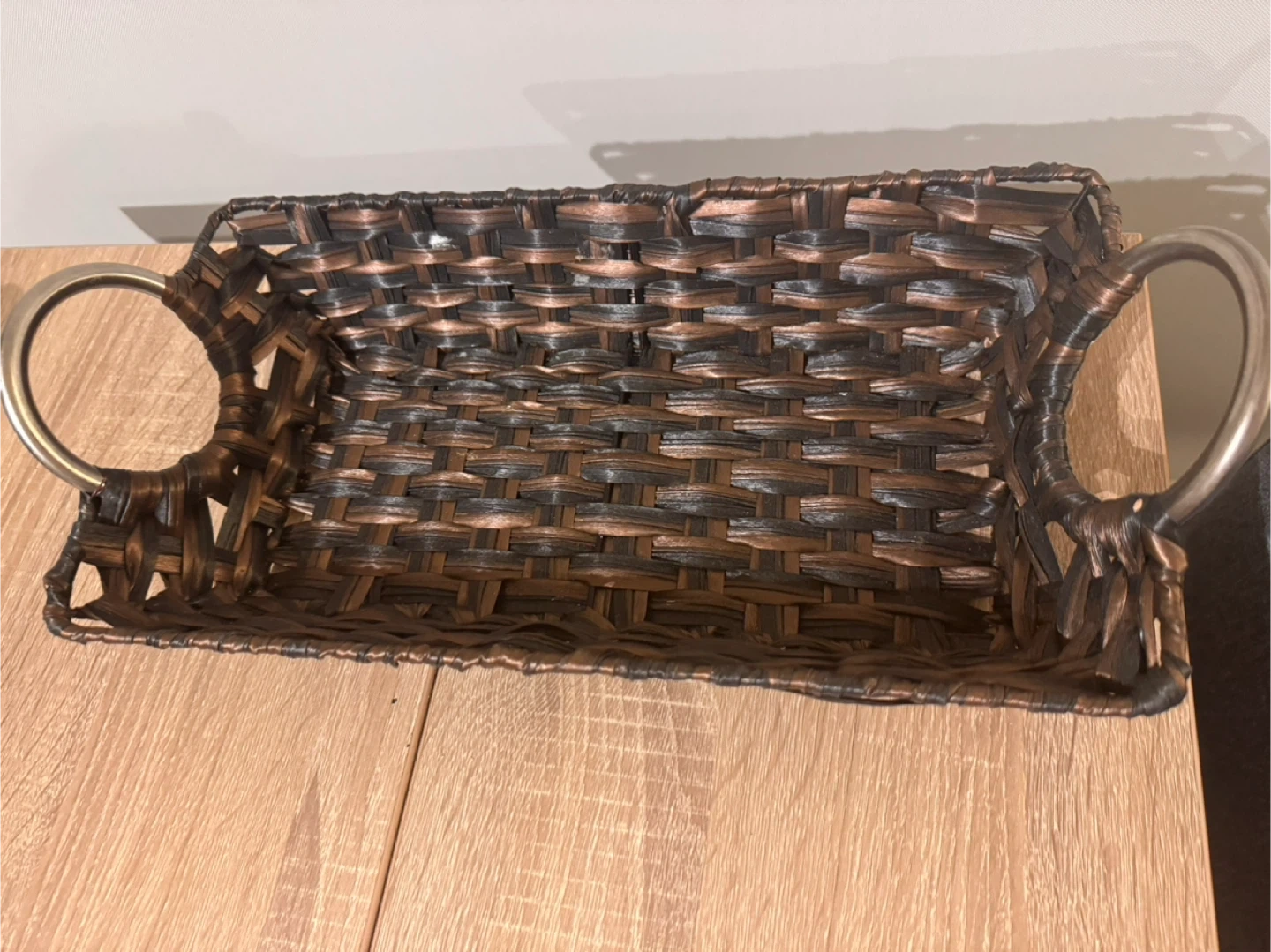 This rectangular basket is woven from dark brown and black material. It features two silver metal ring handles on the shorter sides. Its design makes it a nice addition for organizing small items.