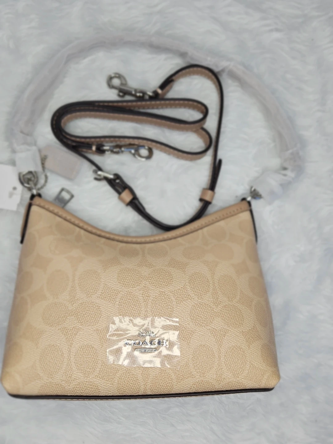 This is a brand new Coach shoulder bag in beige jacquard. It’s a stylish and versatile accessory that’s never been used. Perfect for adding a touch of elegance to any outfit!