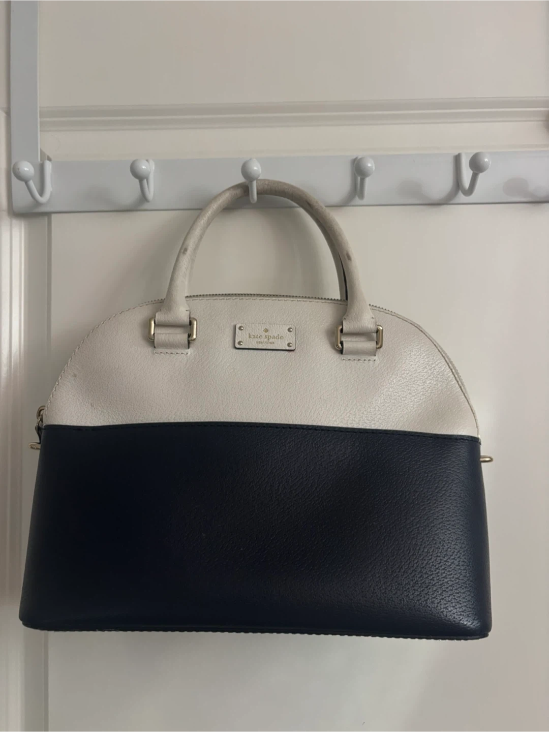 This Kate Spade New York satchel features a two-tone design in white and navy blue leather. It's a stylish and practical accessory for everyday use. Leather material.