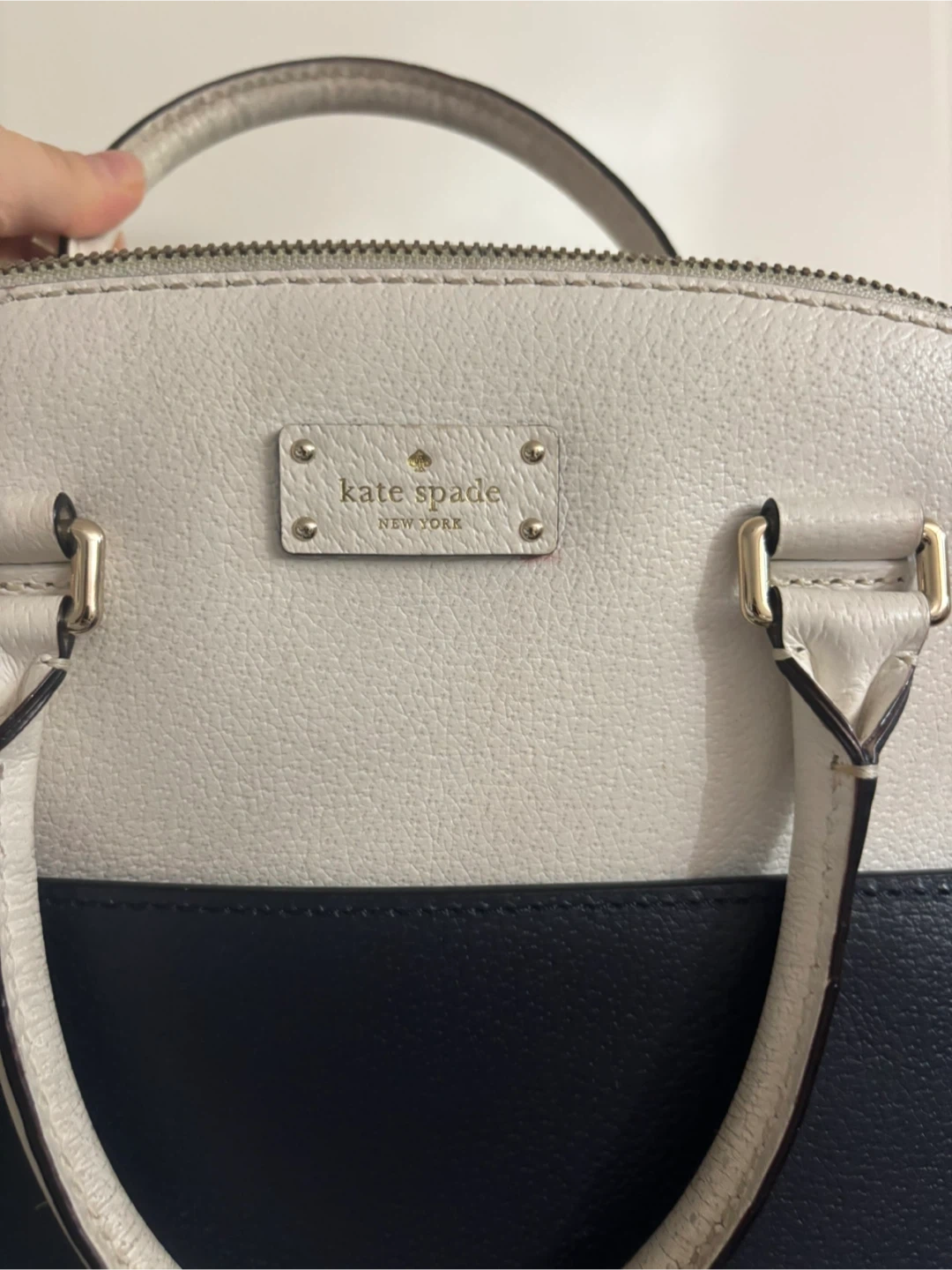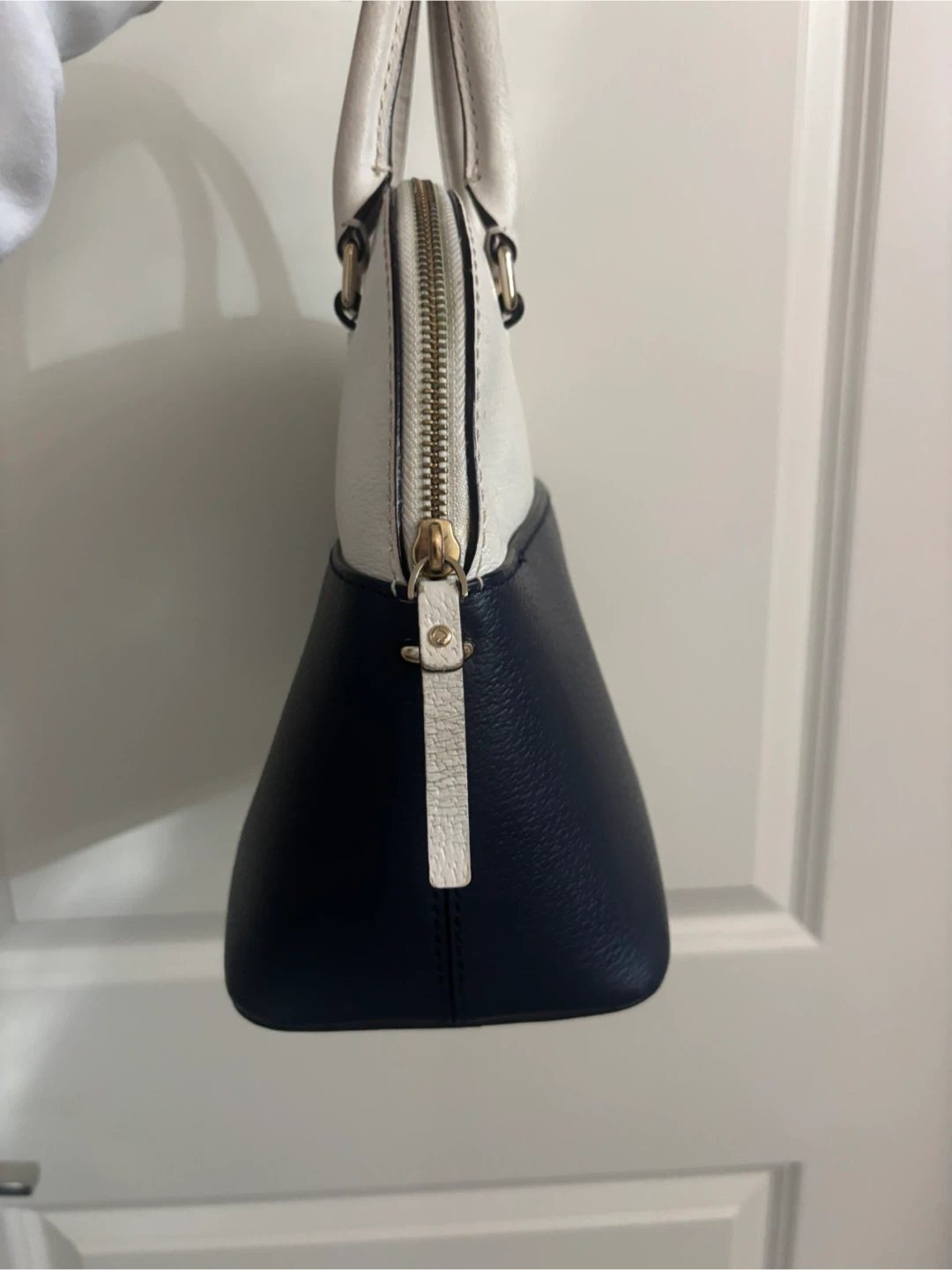 This Kate Spade New York satchel features a two-tone design in white and navy blue leather. It's a stylish and practical accessory for everyday use. Leather material.
