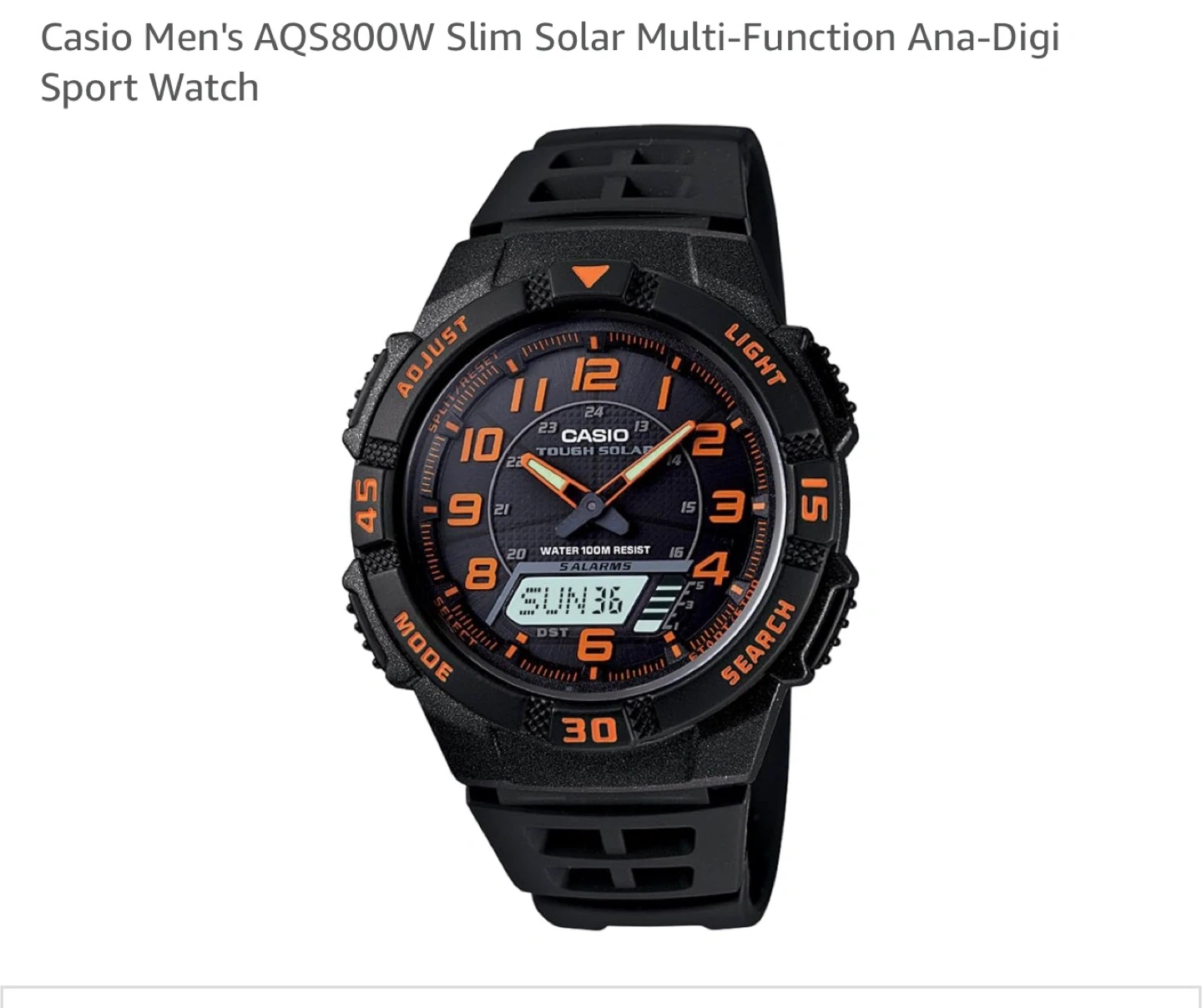 This is a Casio Men's AQS800W watch. It's a slim, solar-powered ana-digi sport watch. Water resistant to 100m and has 5 alarms. The band is black.