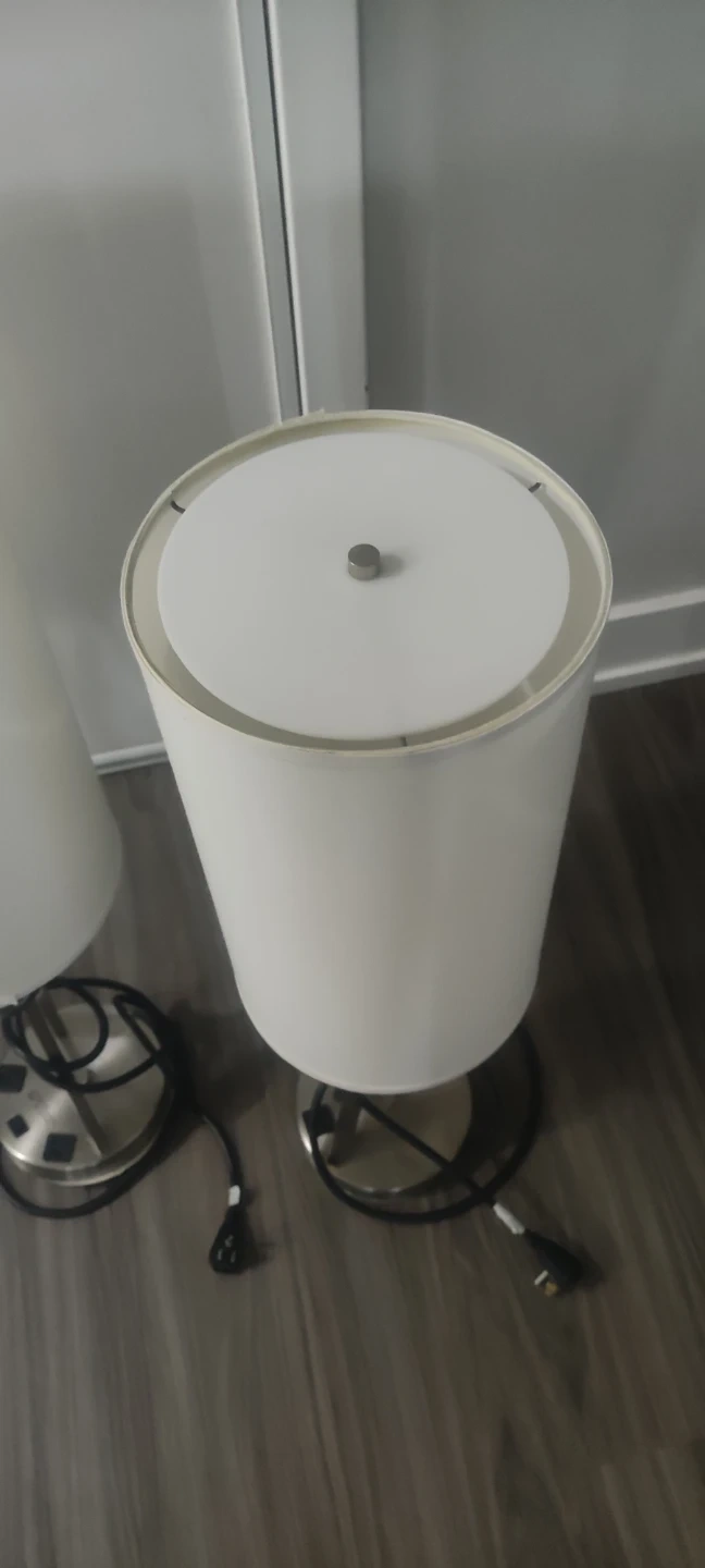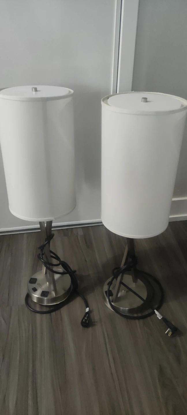 Selling a pair of table lamps. They are white with a cylindrical shade and a silver base. Great for bedside tables or living room lighting