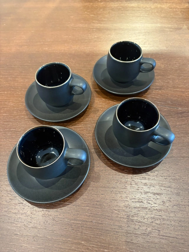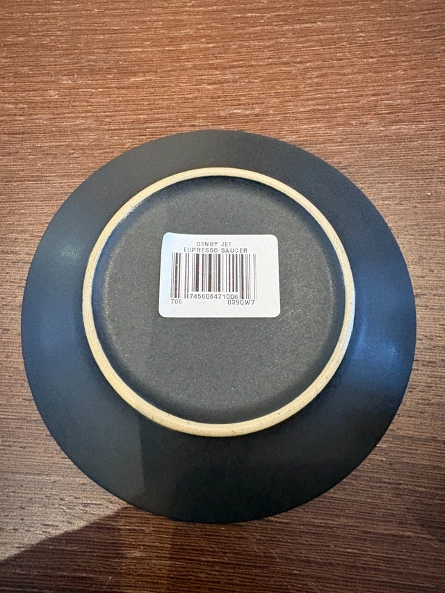 Brand new Denby Jet Espresso Cup & Saucer in Matte Black. Cup size: 2-2/3" x 2-1/4". Four available at $15.00 each. Cash accepted, cashless payment accepted. Curbside pickup available.