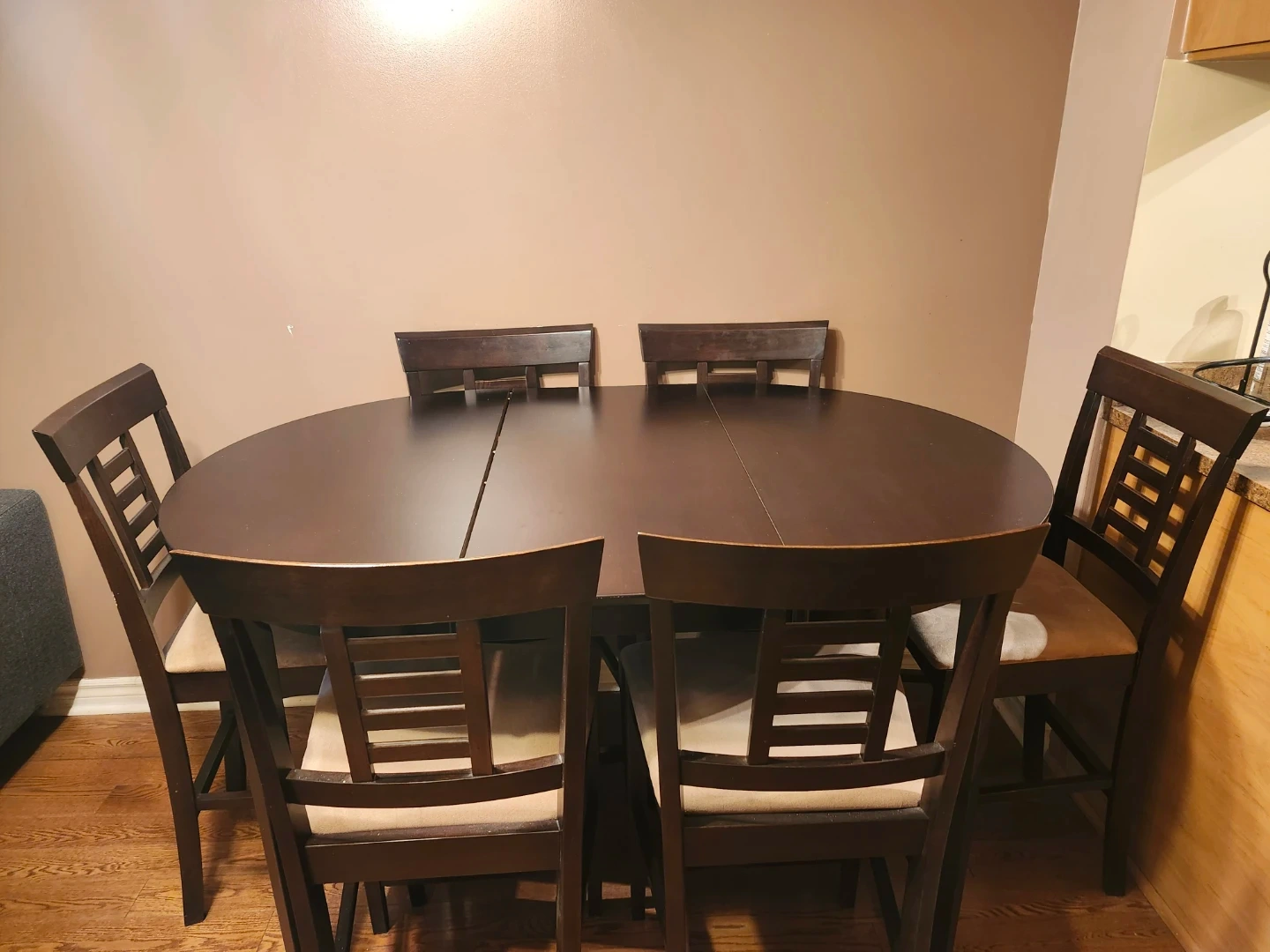 A dark brown round dining table that extends to an oval shape. It comes with six matching chairs featuring upholstered seats. This set is perfect for smaller dining areas or kitchens that need flexible seating.