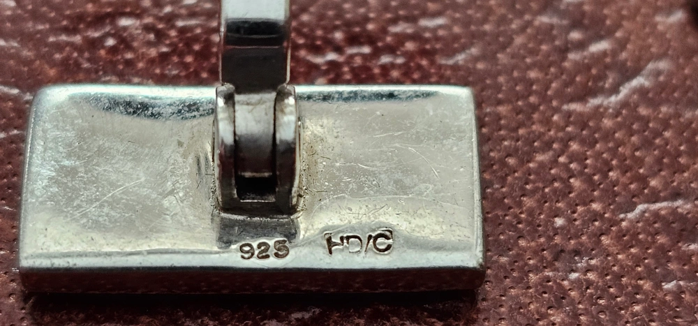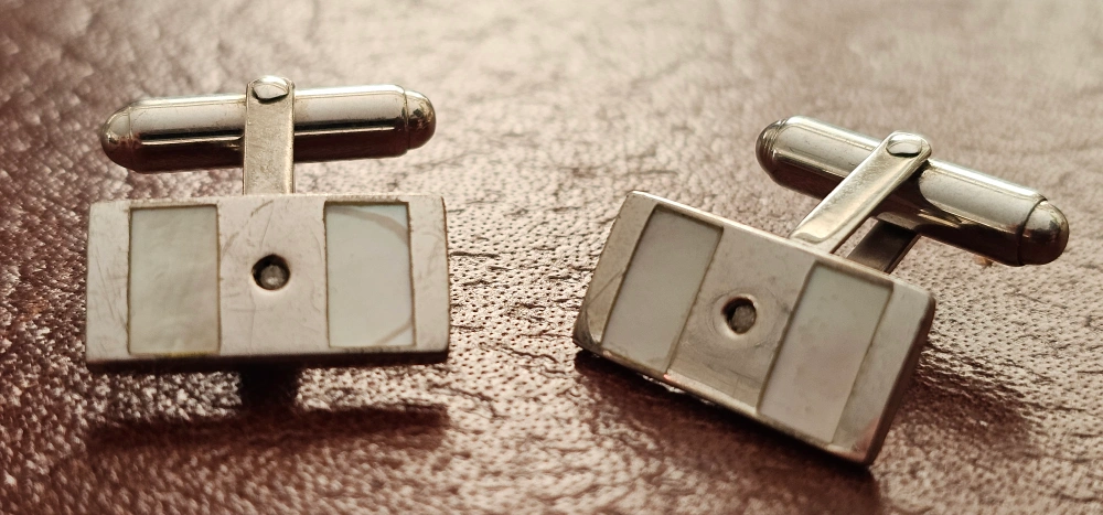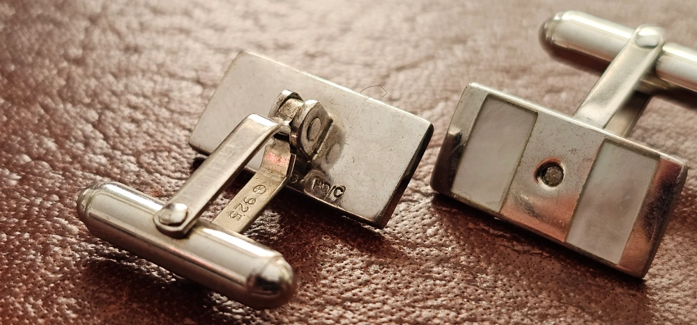 Pair of men's cufflinks. Sterling silver. Rectangular design. Features mother of pearl inlay. FD/G 925 hallmark.