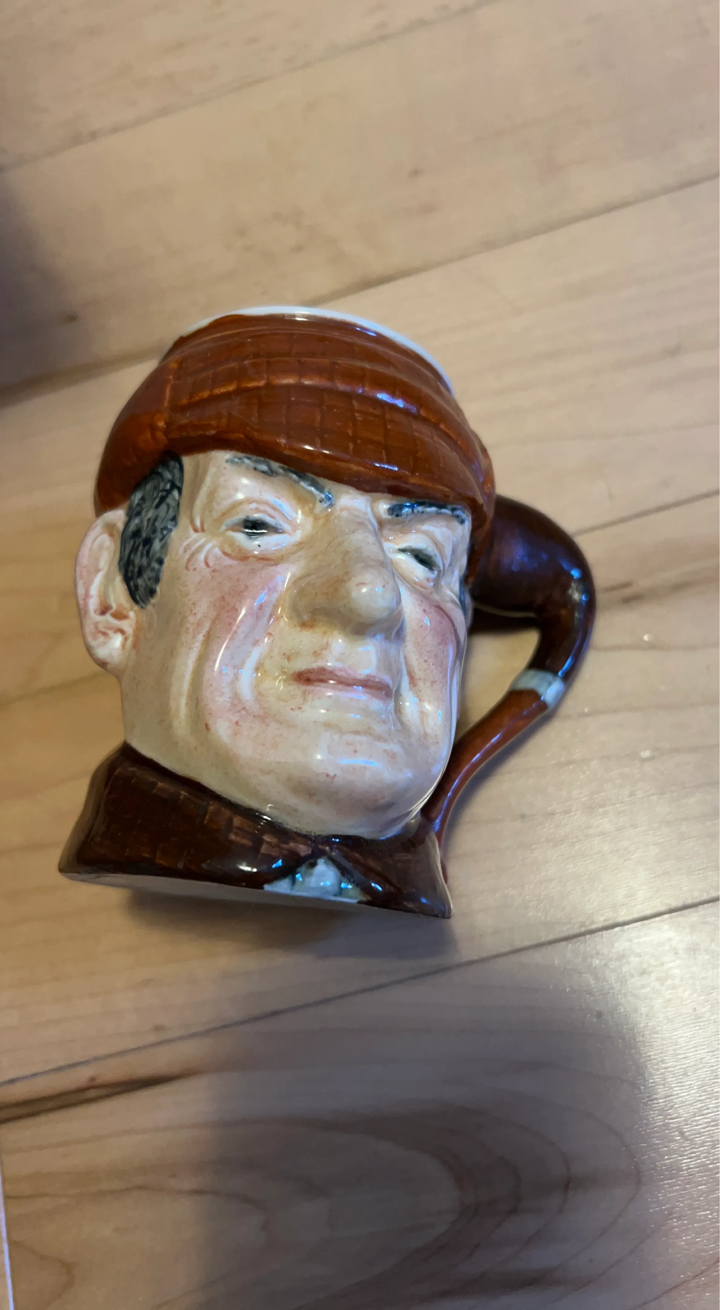 This is a novelty mug of Sherlock Holmes. It's made of ceramic. This mug would be a fun addition to a collection or for use during tea time!
