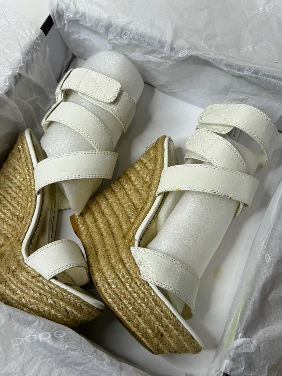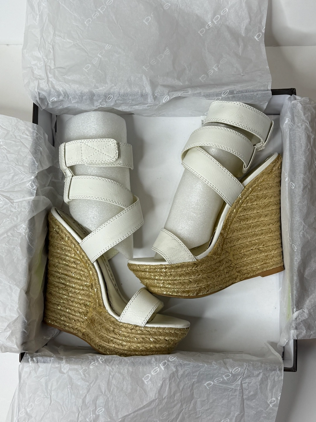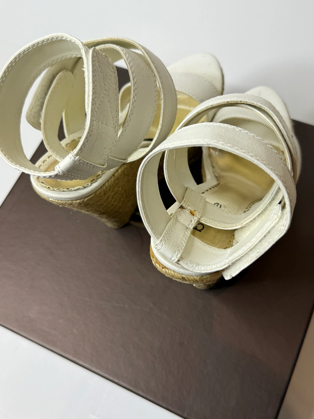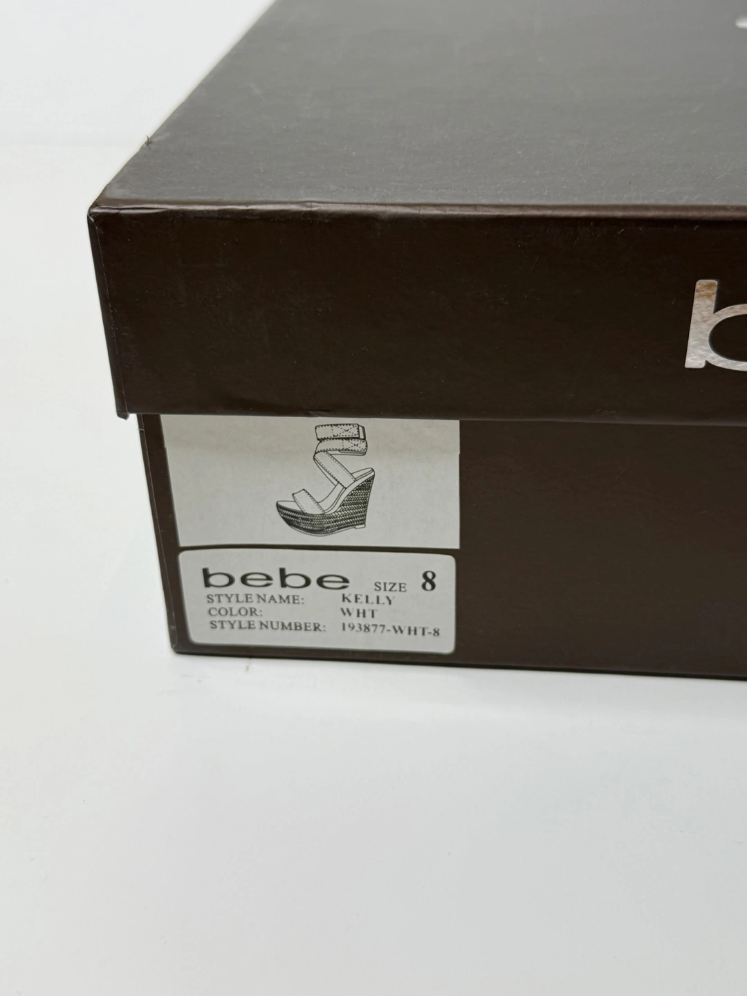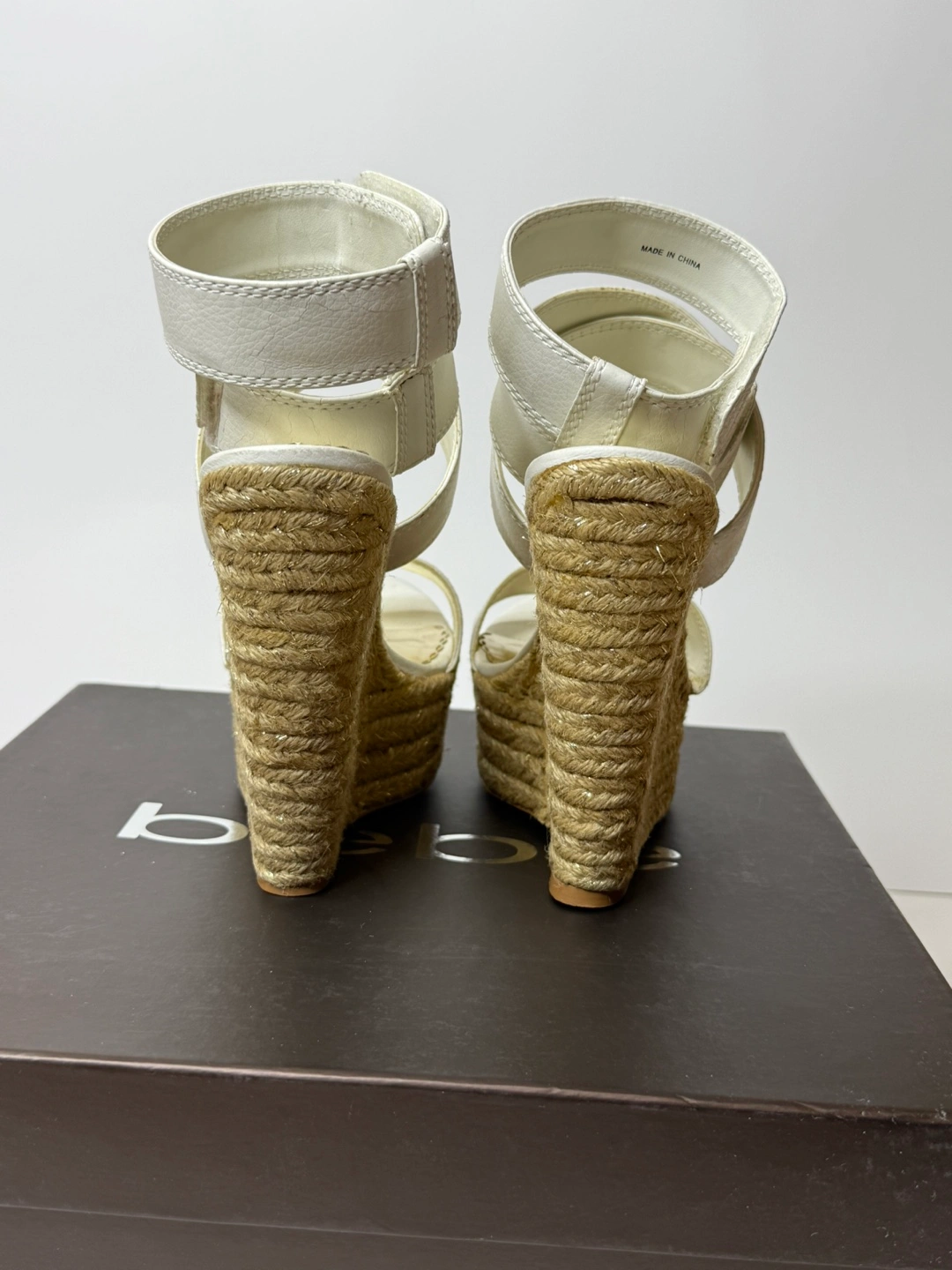 Bebe white, color wedges! Has some wear and tear on the shoes in different spots. As seen in the pictures. Comes with original box. Size 8.