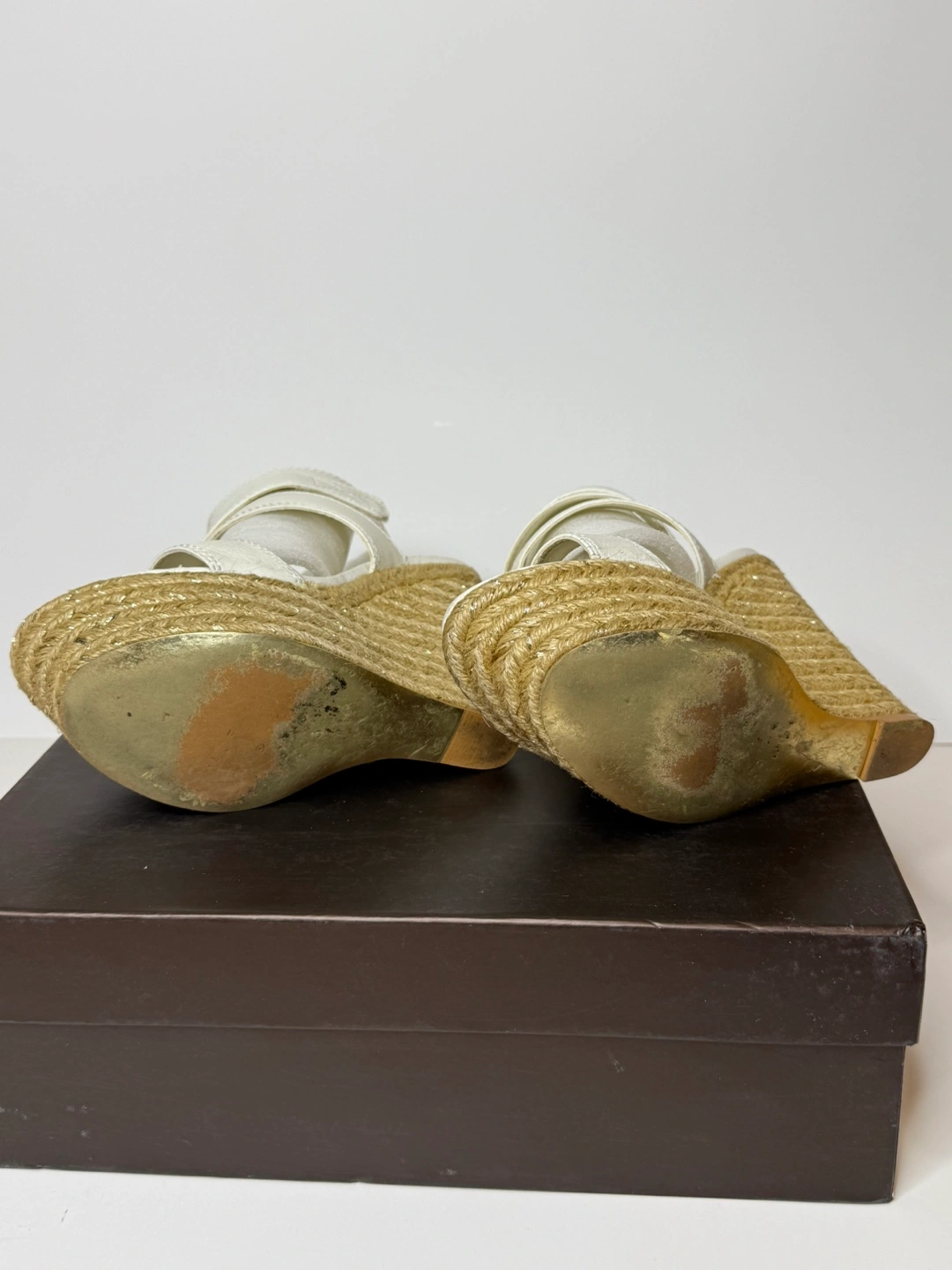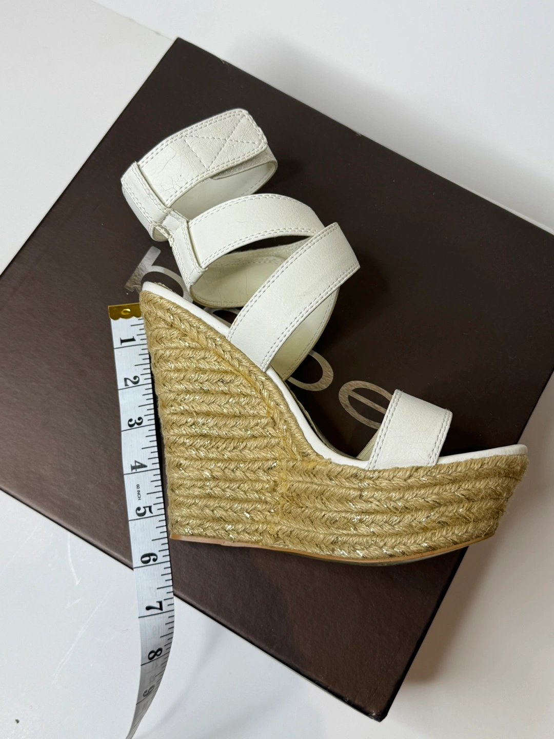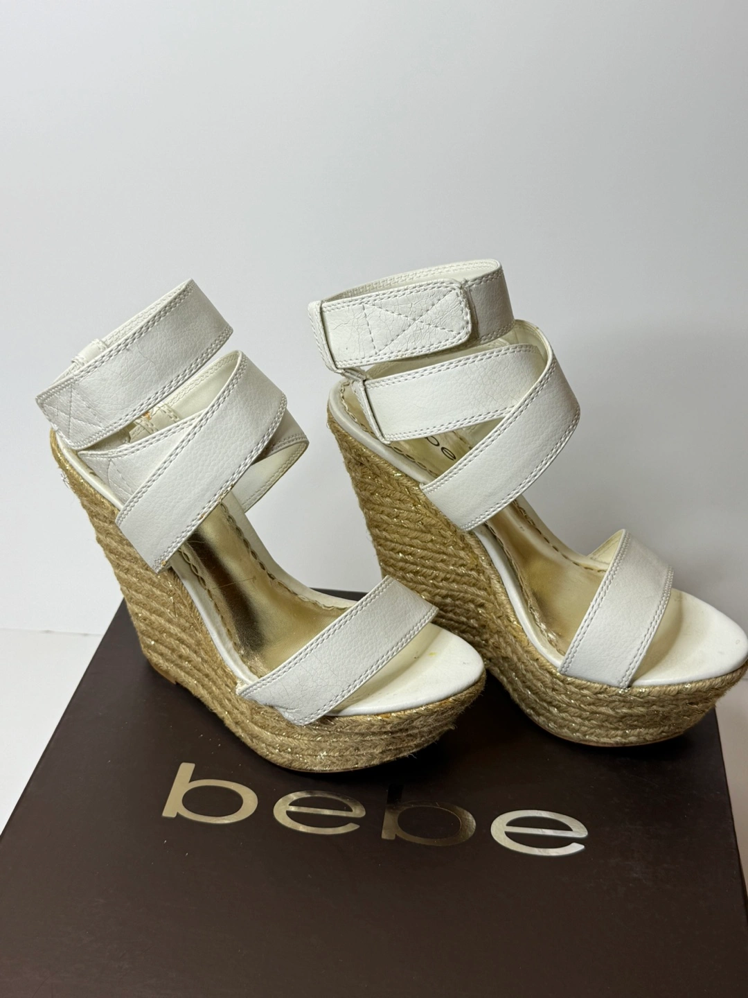 Bebe white, color wedges! Has some wear and tear on the shoes in different spots. As seen in the pictures. Comes with original box. Size 8.