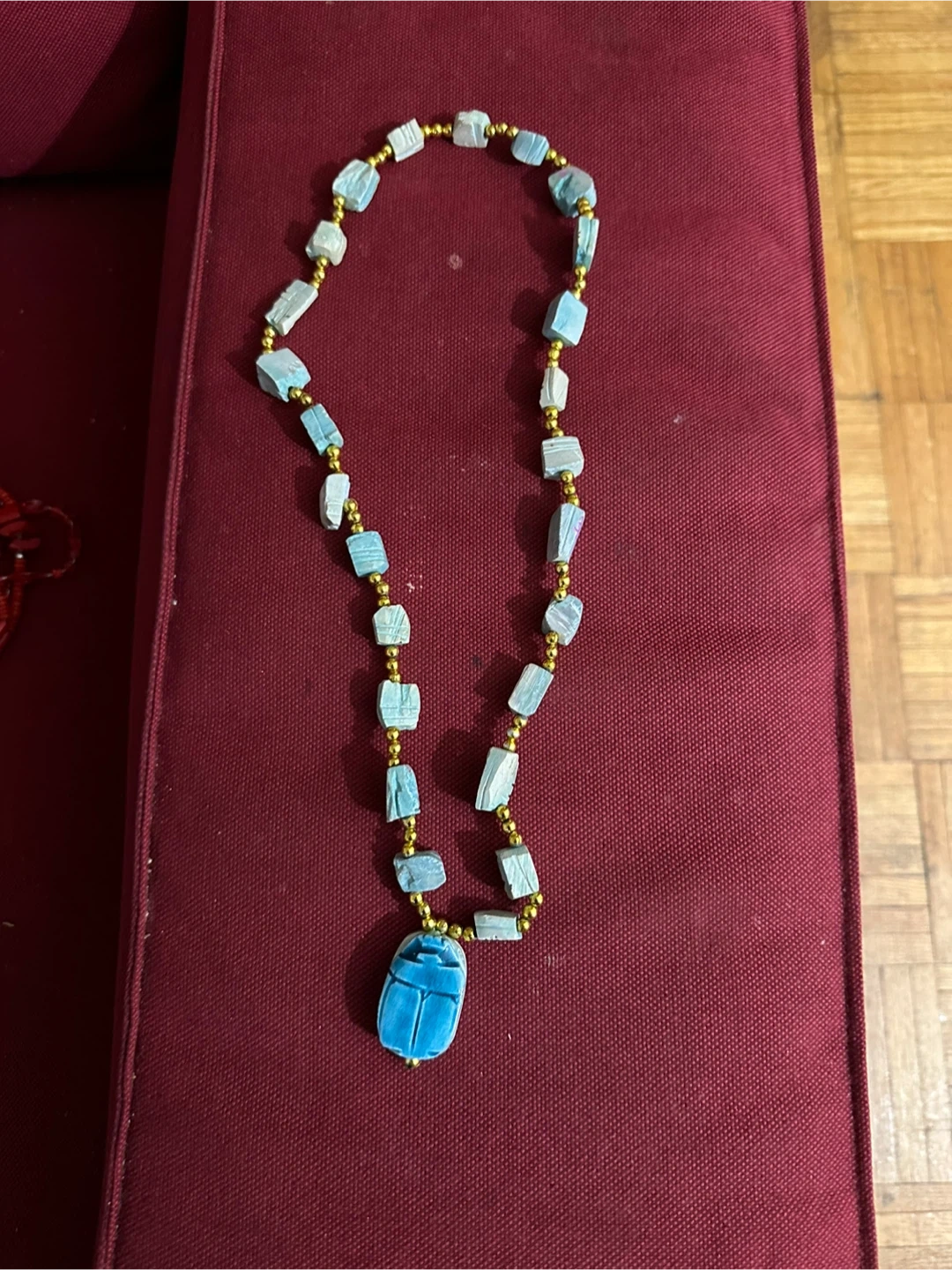 Selling a unique turquoise scarab necklace! The beads are a lovely light blue, accented with gold-tone spacers. The scarab pendant adds a touch of Egyptian-inspired style to any outfit