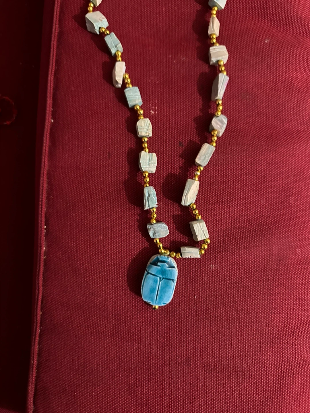 Selling a unique turquoise scarab necklace! The beads are a lovely light blue, accented with gold-tone spacers. The scarab pendant adds a touch of Egyptian-inspired style to any outfit