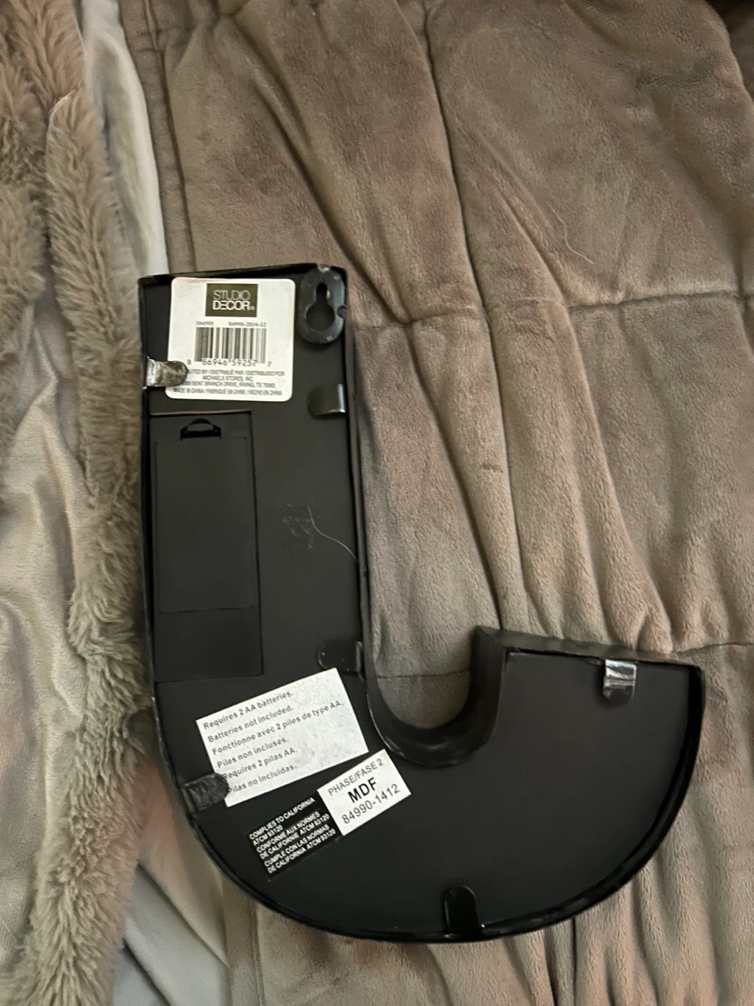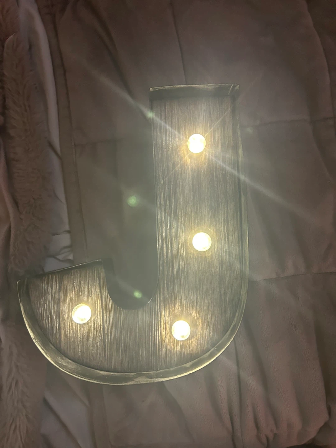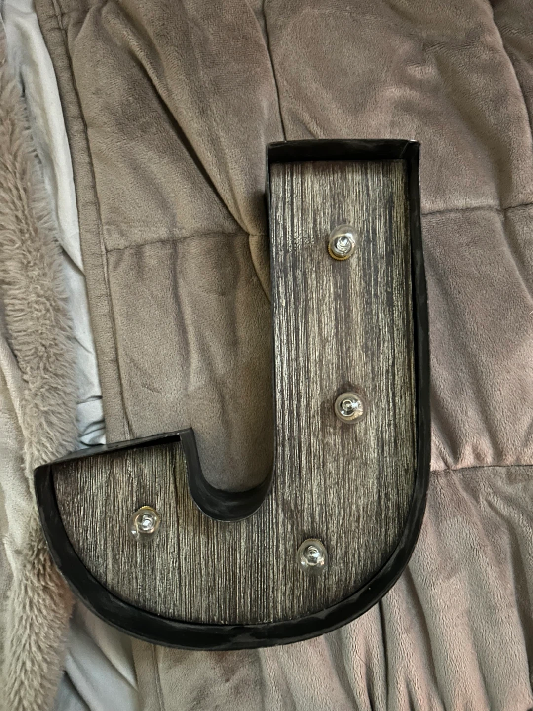 This is a light-up letter J from Studio Decor. It's designed with a rustic wood-look finish and has five built-in LED bulbs. It requires 2 AA batteries including the ones that came with the product at purchase.