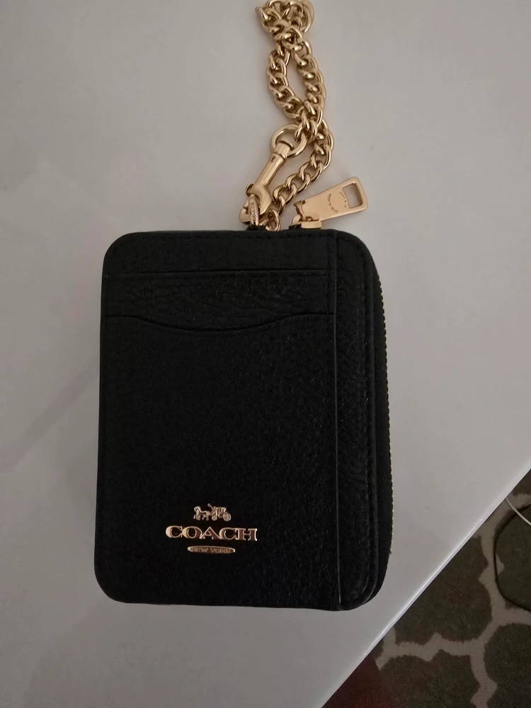 Selling a stylish Coach card holder in black leather! It features a convenient chain, perfect for keeping your cards secure and accessible. This card holder is in great condition and ready for a new home