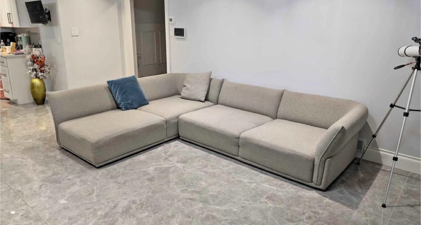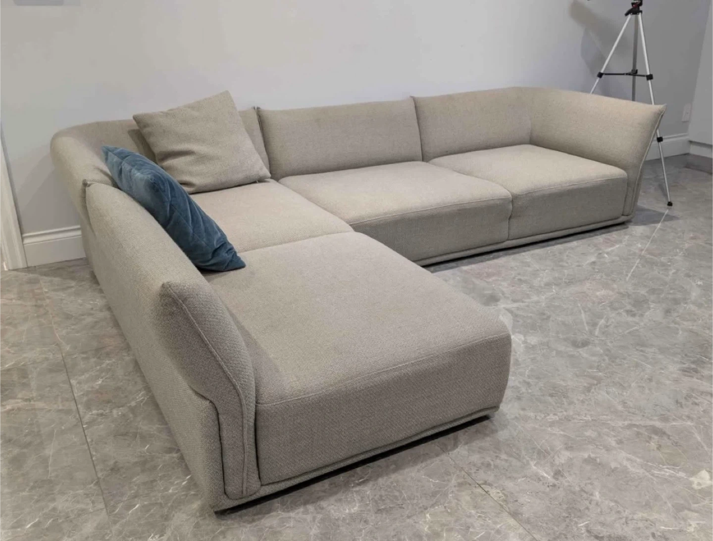 • Modern, light grey L-shaped sectional sofa. Beautiful, firm material that is extremely comfortable to sit on.