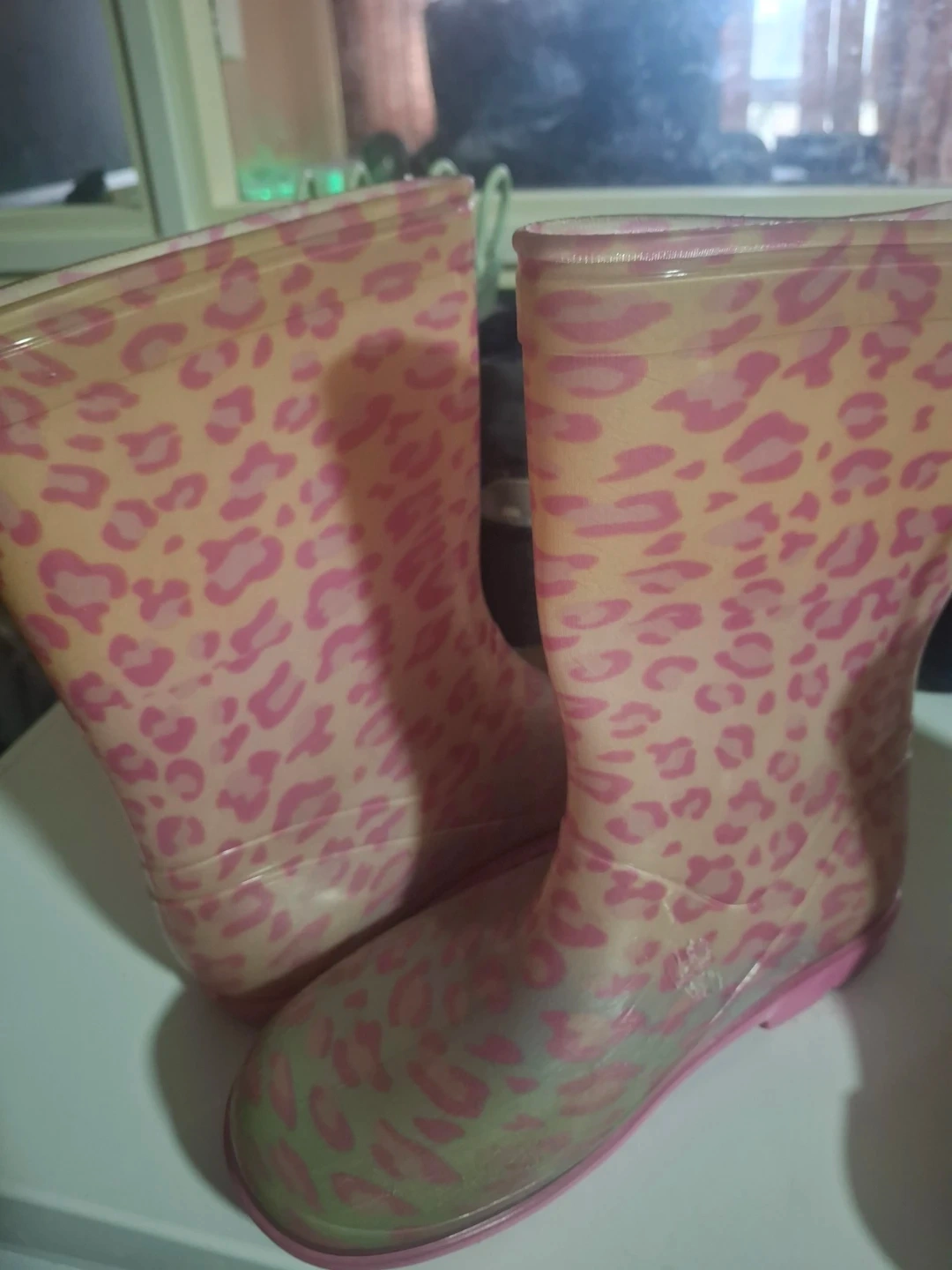 Children's rain boots featuring a fun pink leopard print. These are waterproof and easy to clean. Great for puddle jumping!