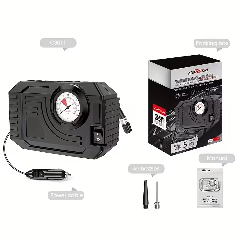 [Carsun Tire Inflator] Carsun 150PSI Tire Inflator for Cars - Portable Air Compressor for Vehicles, Motorcycles, And Bicycles with DC 12 Volt And LED Light, Without Battery