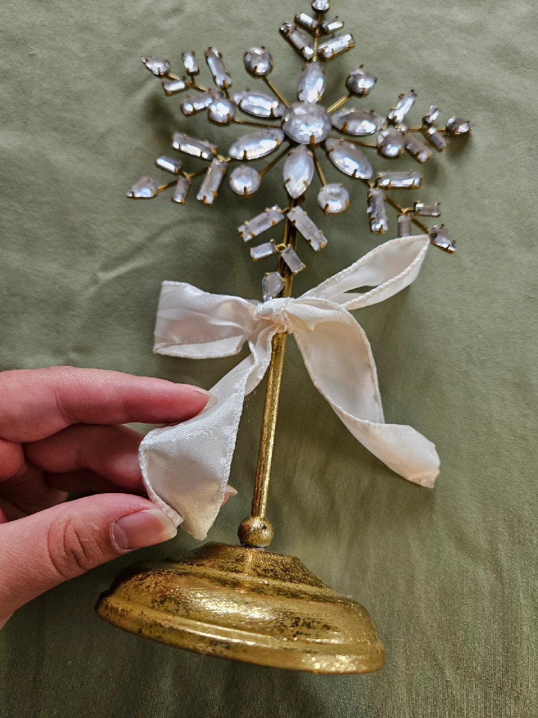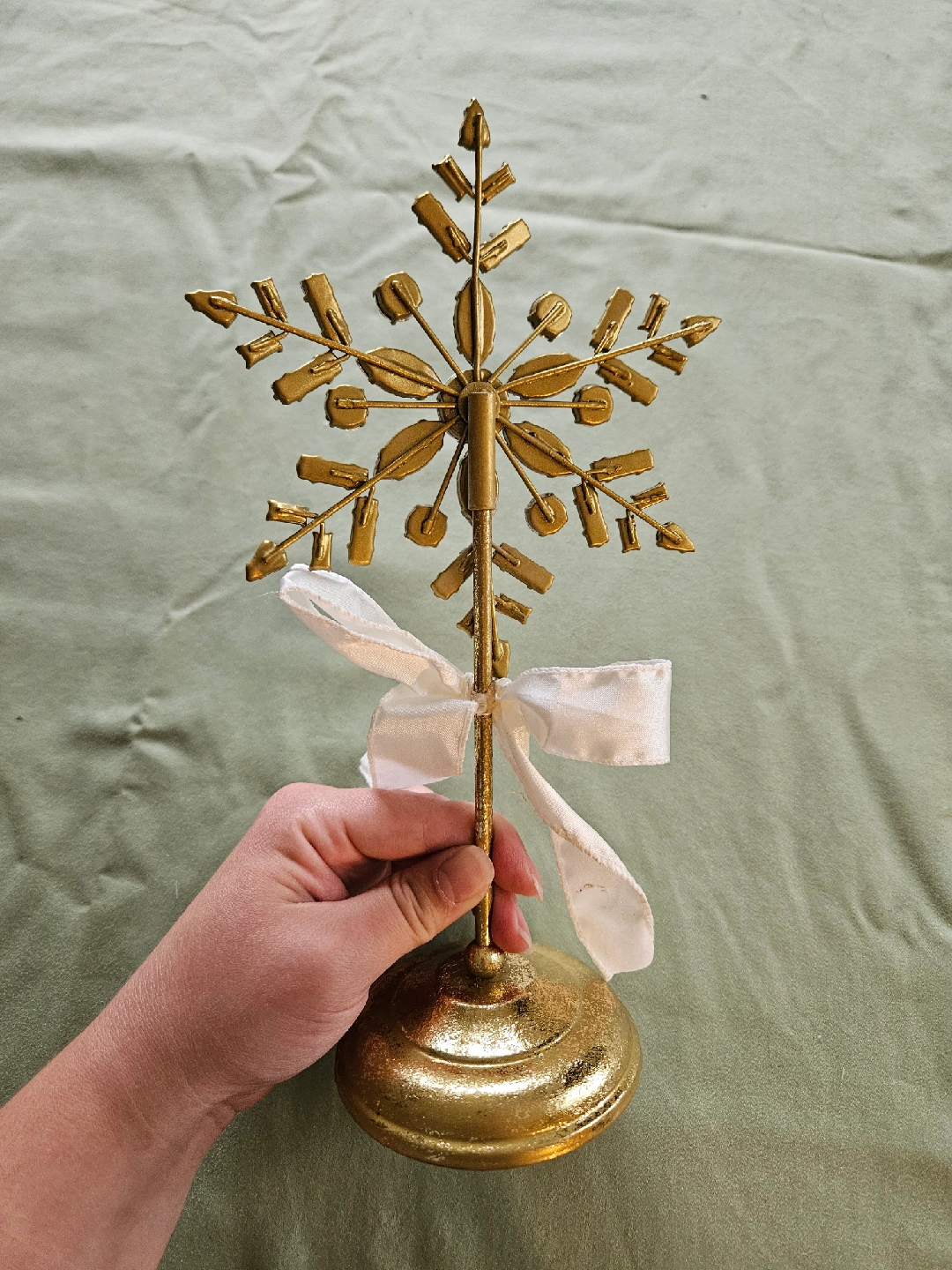 Selling a cute snowflake stand! It's gold and has a white/cream ribbon tied around it. You can easily display it during the holidays or any time of year