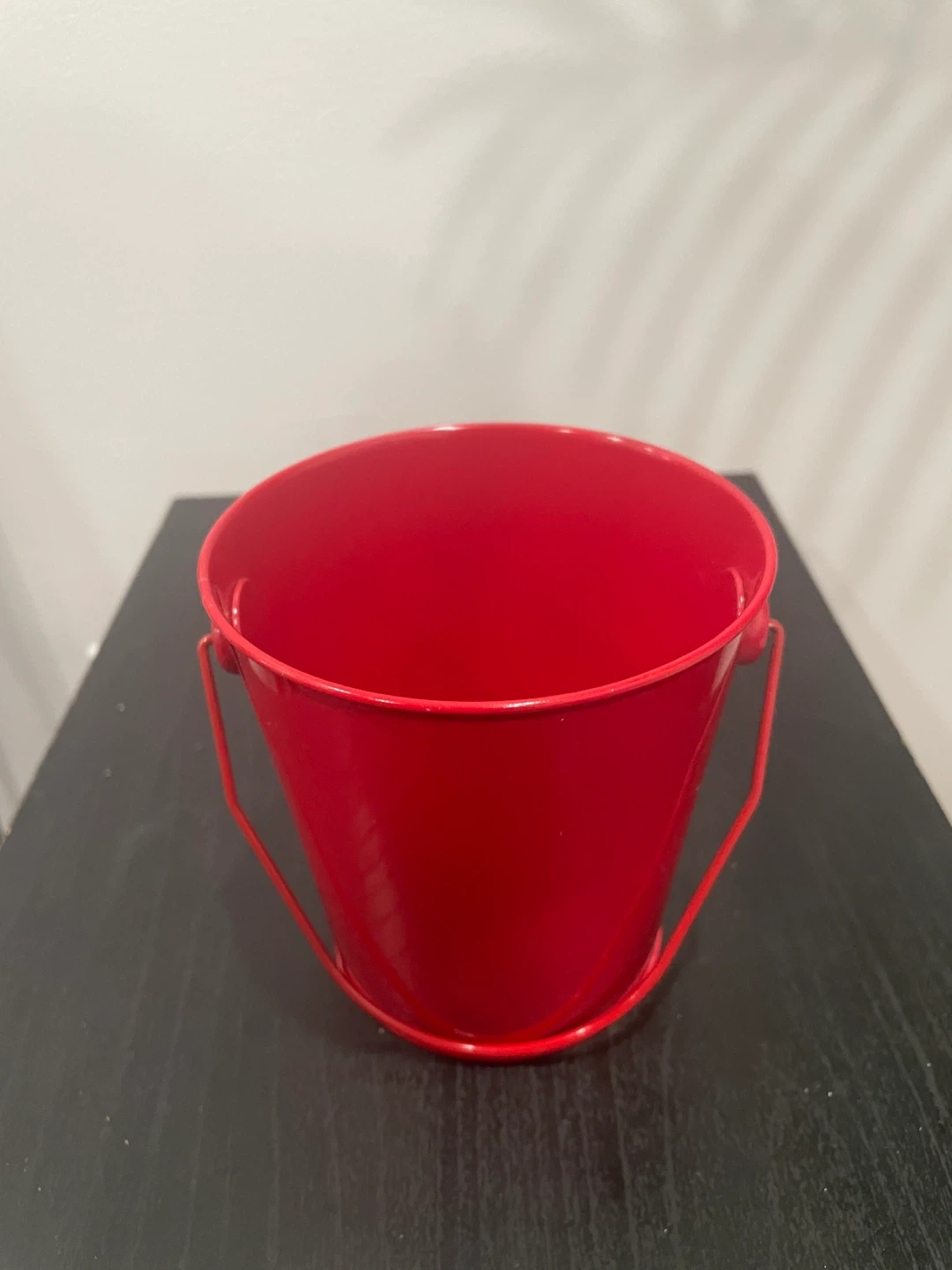 This is a small red metal bucket. It has a wire handle for carrying. It's suitable for decorative use or small storage. Its bright color adds a festive touch!