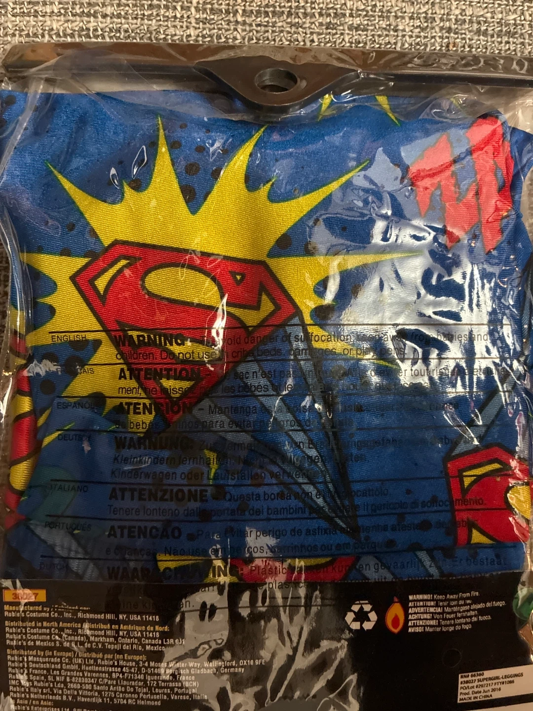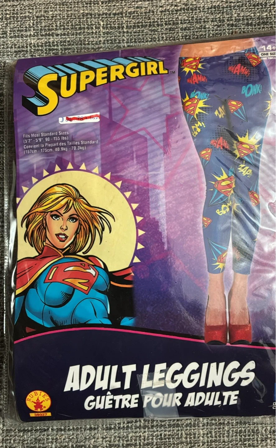 These are new Supergirl adult leggings designed for most standard sizes. They fit heights from 5'2" to 5'9" and weights from 90 to 155 lbs. The leggings feature the iconic Superman "S" shield and "WHAM!" and "BONK!" comic book graphics. They're great for costume parties or themed events!