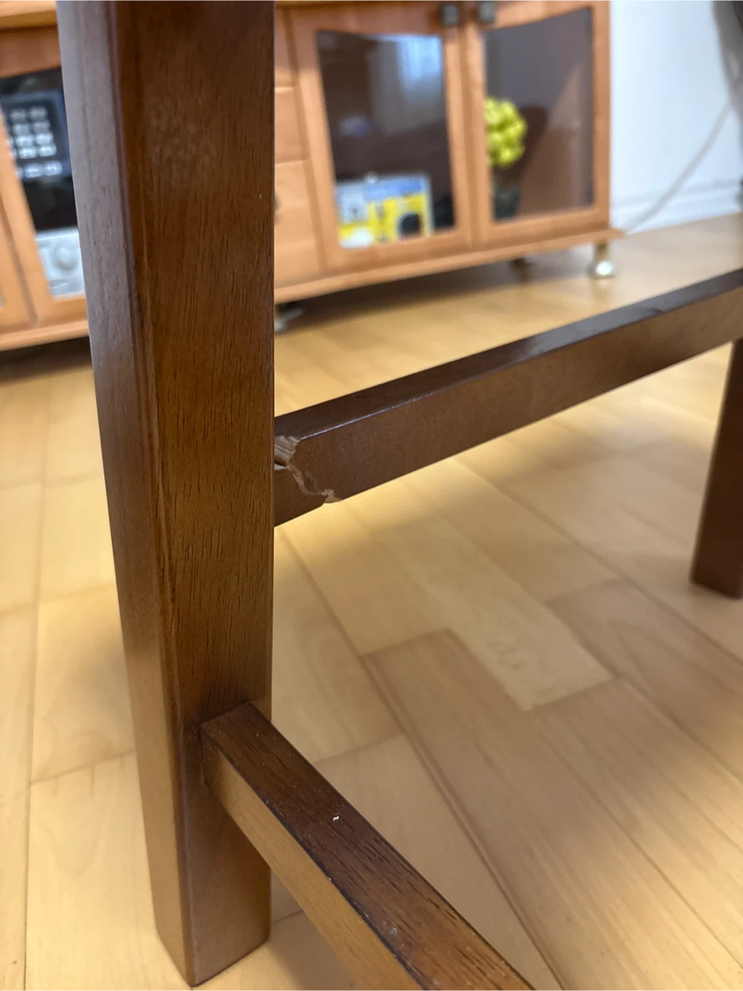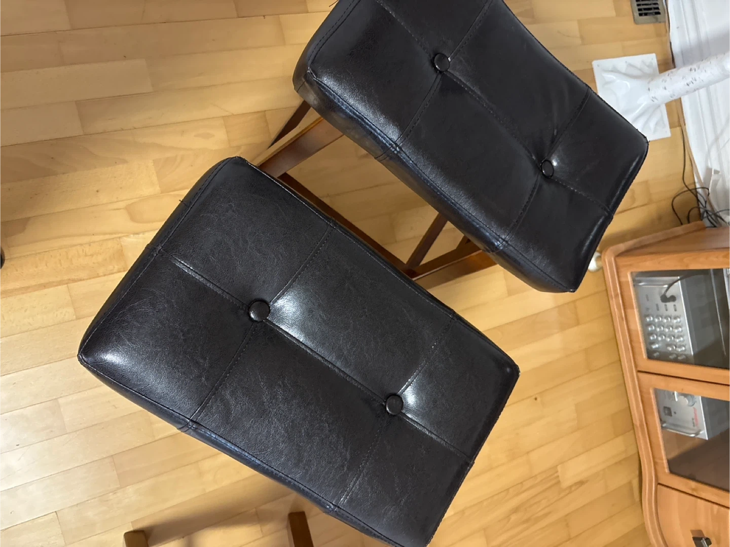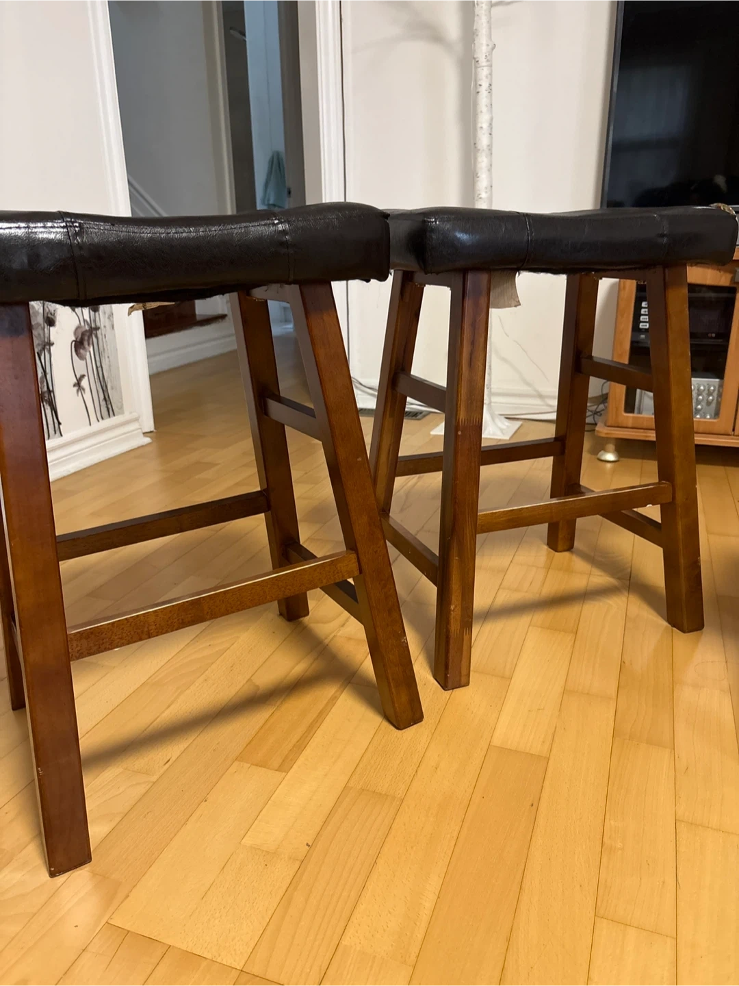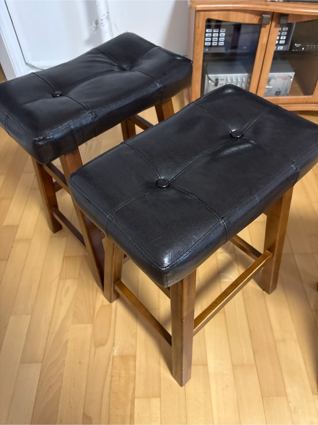 For sale: a set of three counter stools with black tufted faux leather seats and wooden frames. These stools would be great for a kitchen island or home bar, offering both sturdiness and comfort for everyday use. One stool has chipped legs. $20 for all three.