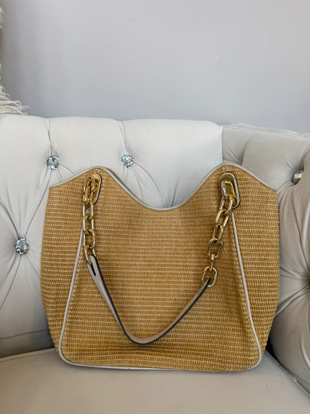 Straw tote bag with chain strap detail. It has an interior zip pocket and a magnetic snap closure. Beige lining with Michael Kors logo pattern.