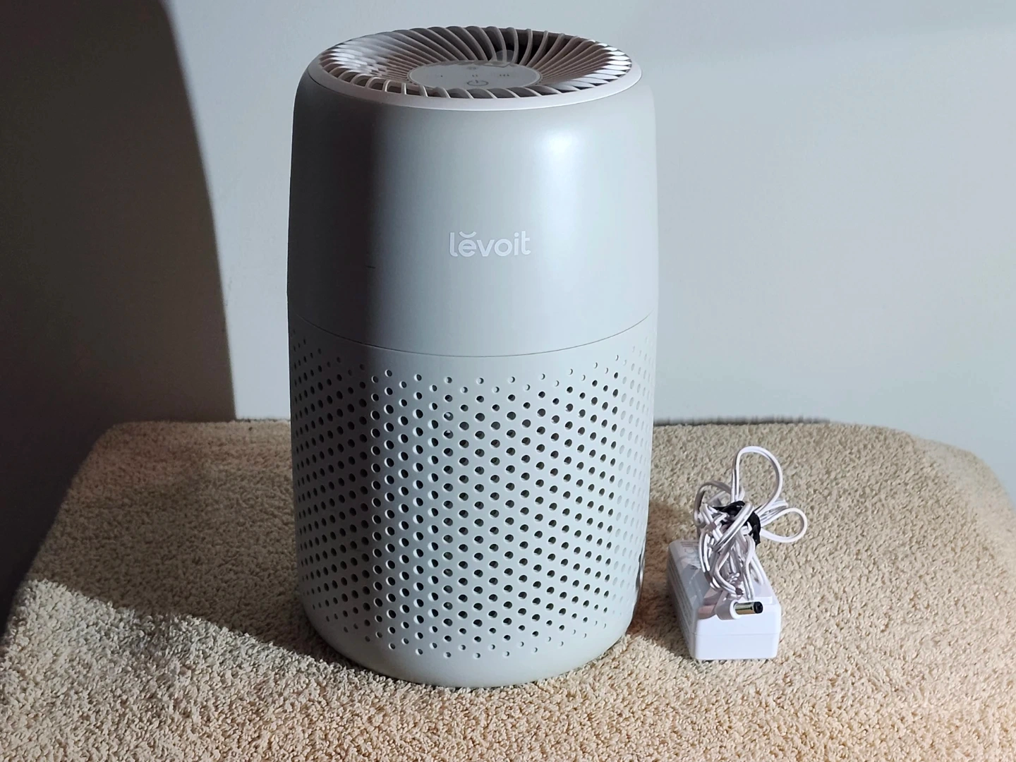 This is a Levoit air purifier. It's a compact unit with a power adapter included. Air purifier for small to medium rooms.