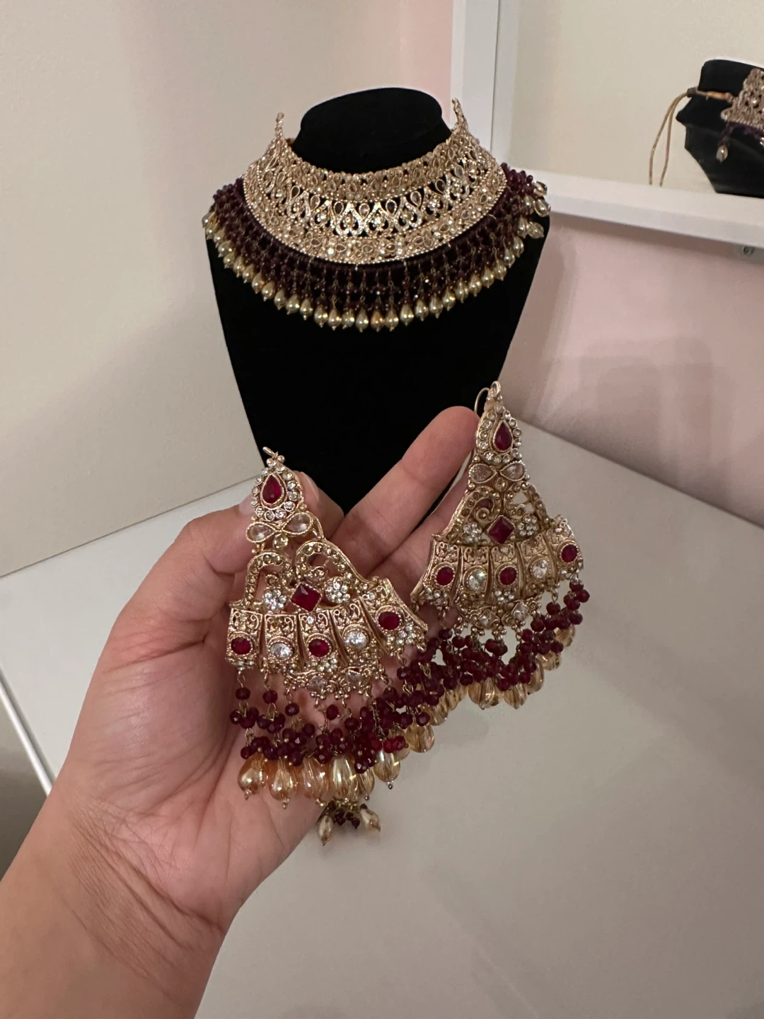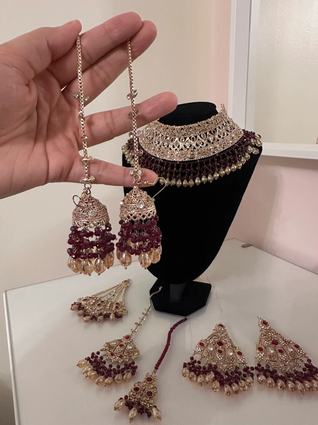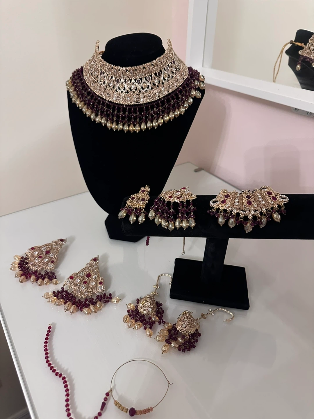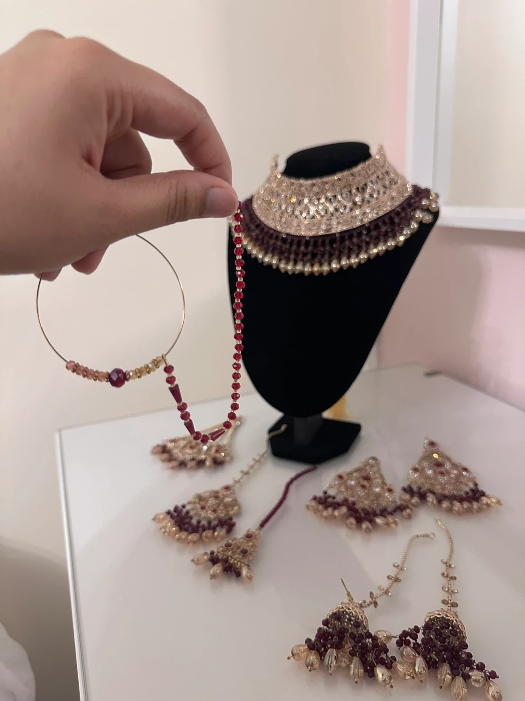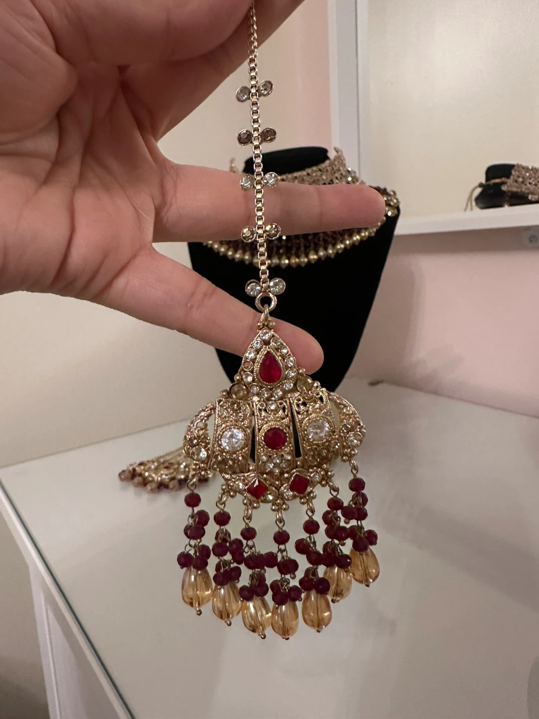 Beautiful Indian/Pakistani jewellery set in excellent condition. Includes a necklace, Jhumar, 2 headpiece (Maang Teeka), 2 Set of earrings, and Nose Ring (Nath) as pictured. Perfect for weddings, Brides or special occasions!