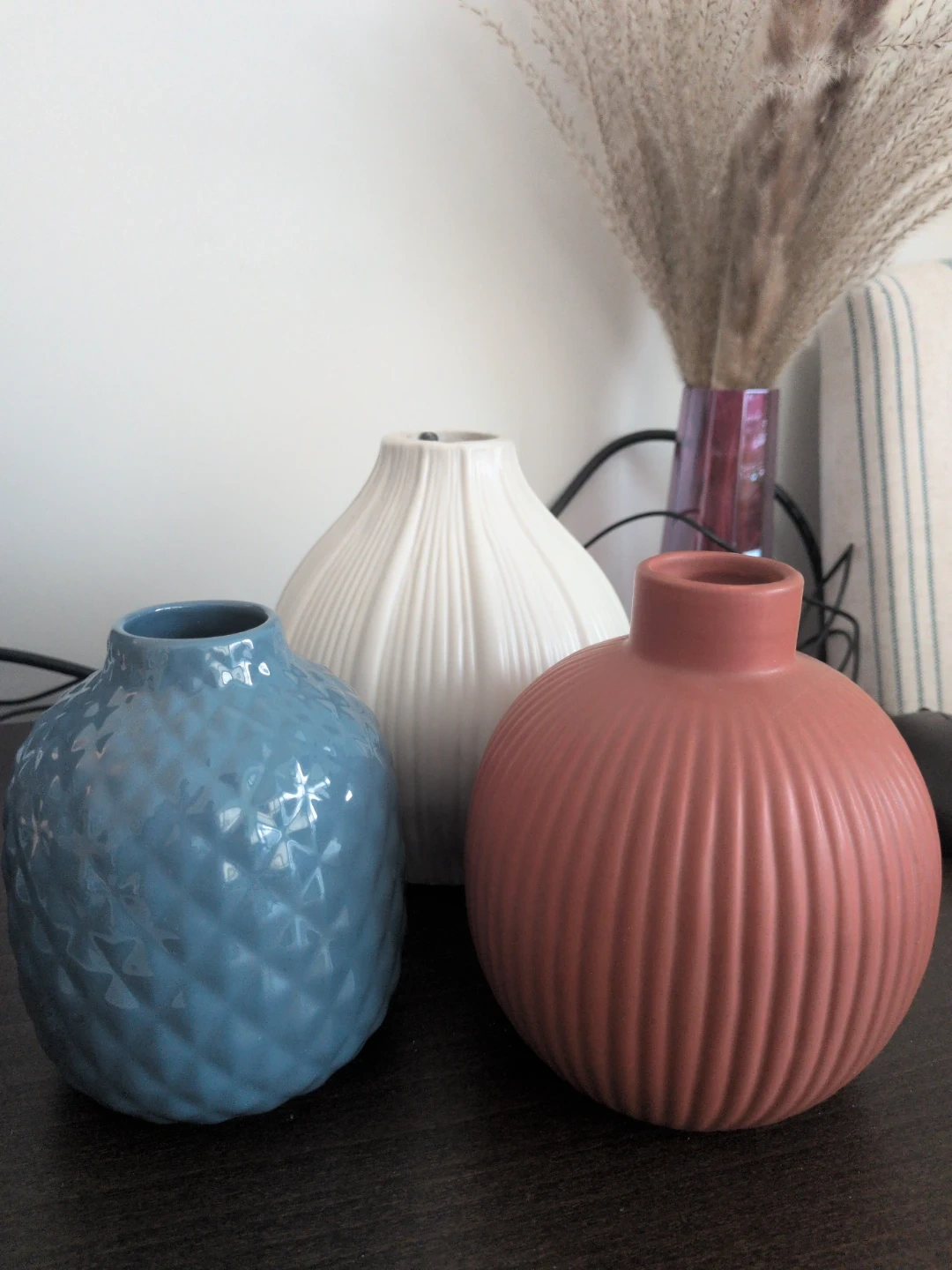 A set of three decorative ceramic vases. One is a ribbed terracotta colour, another is a textured blue, and the third is a white ribbed vase. They're perfect for adding a touch of style to any room.