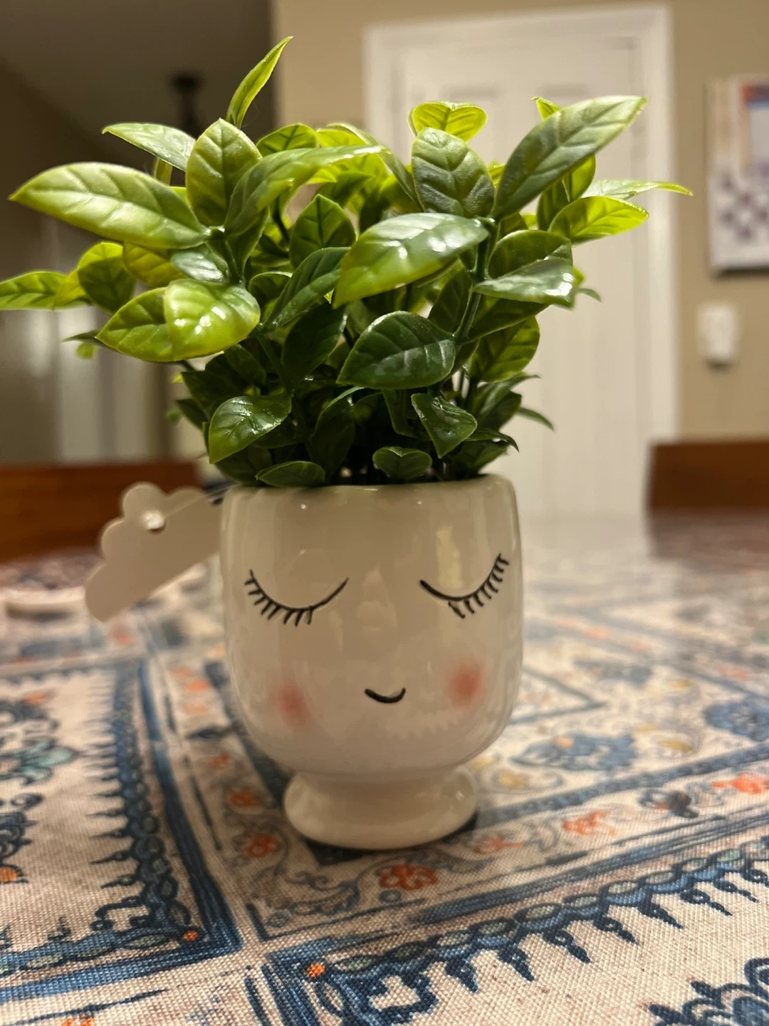 This artificial plant comes in a charming ceramic planter with a cute sleeping face design. It's a delightful decorative piece for any space. Ceramic planter with a whimsical design.