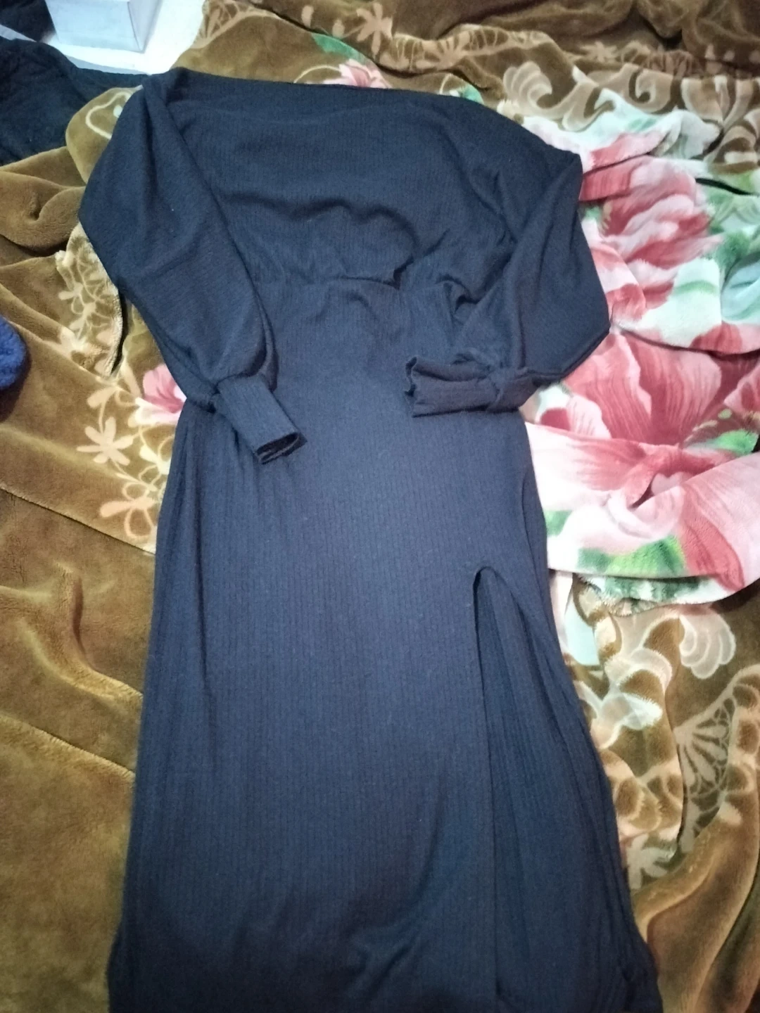 Black ribbed midi dress with long sleeves and a fashionable high slit. The material is stretchy and comfortable. It's a versatile piece suitable for various occasions.
