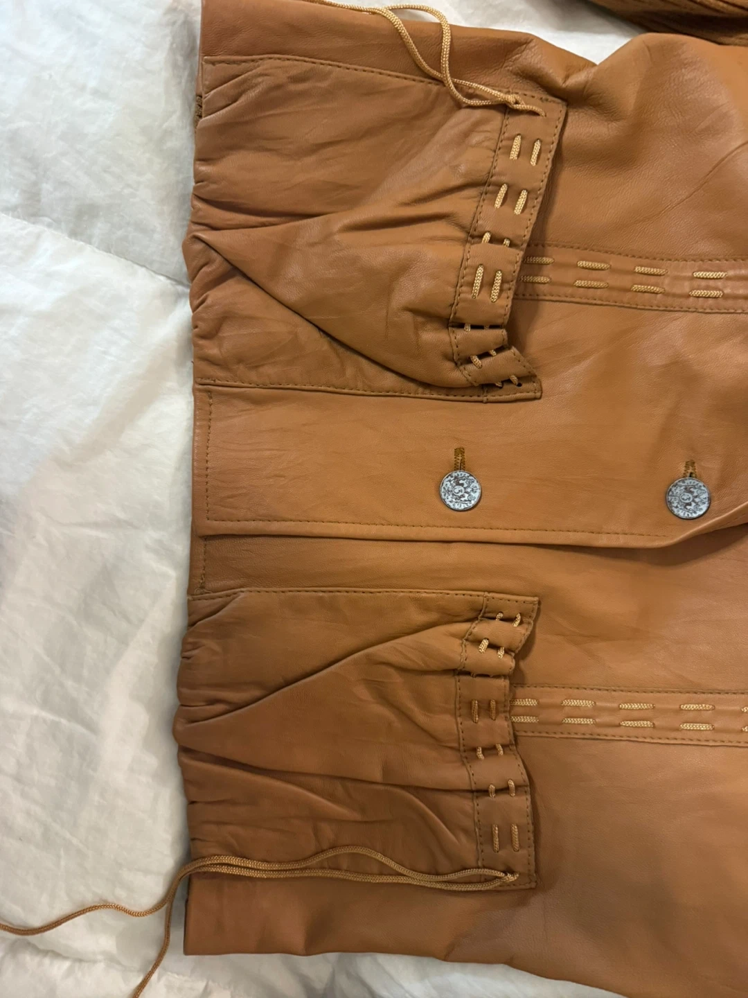 Genuine leather and knit jacket. 65% rayon, 35% nylon sleeves. 100% polyester lining. This jacket is great for layering during transitional weather!