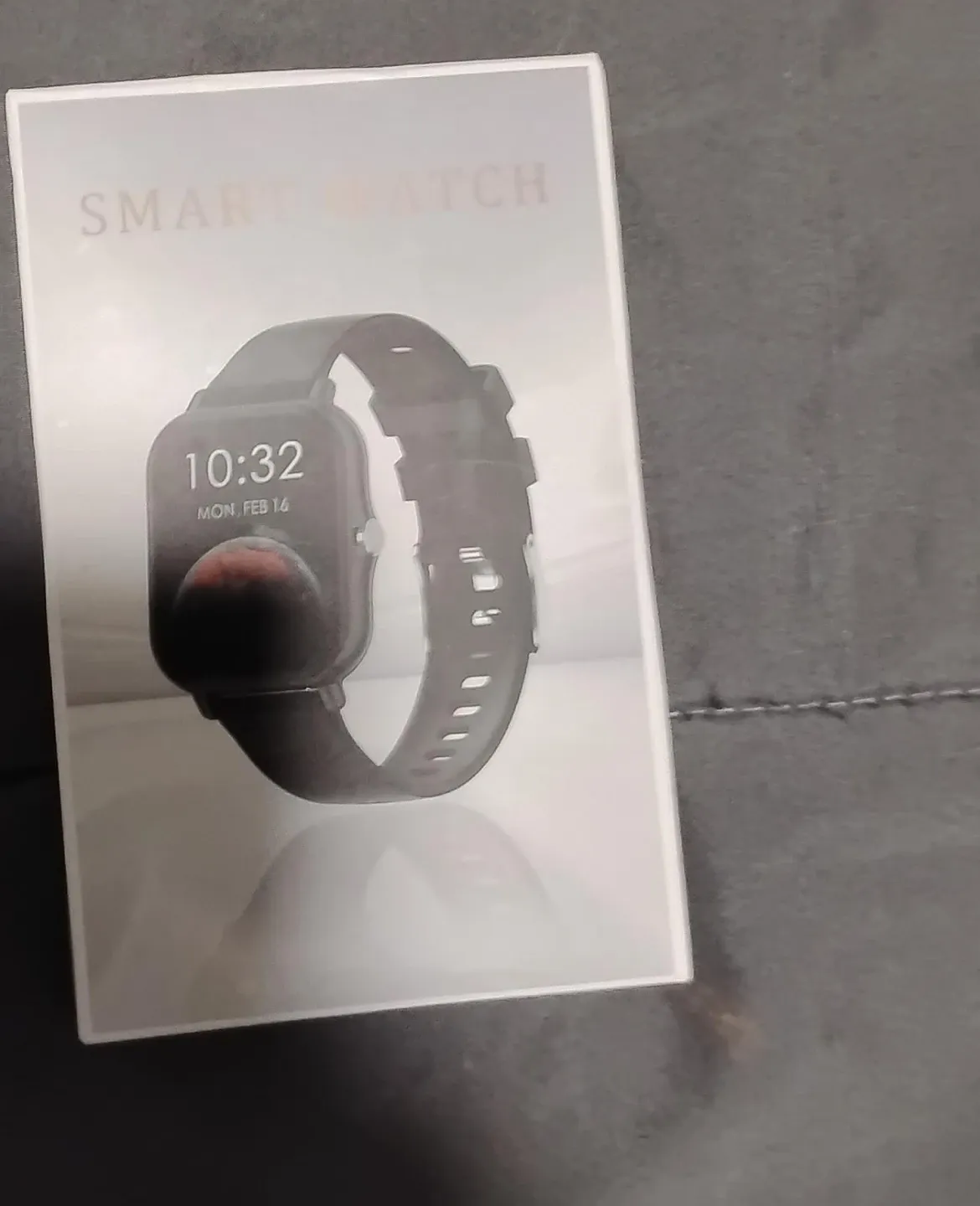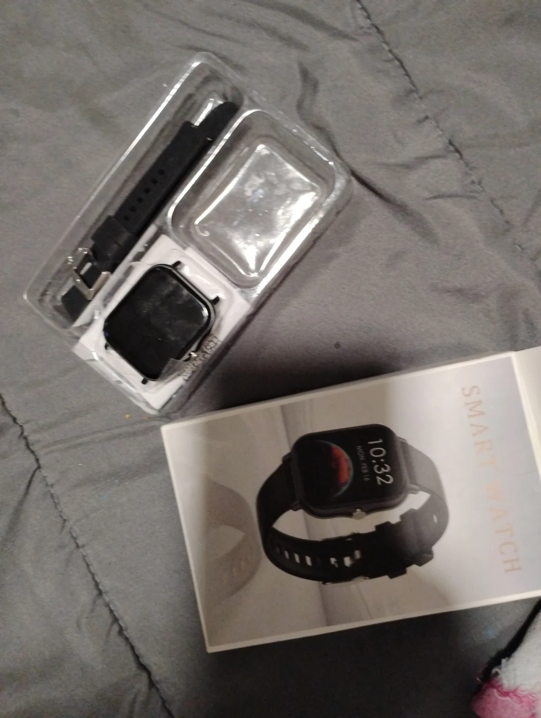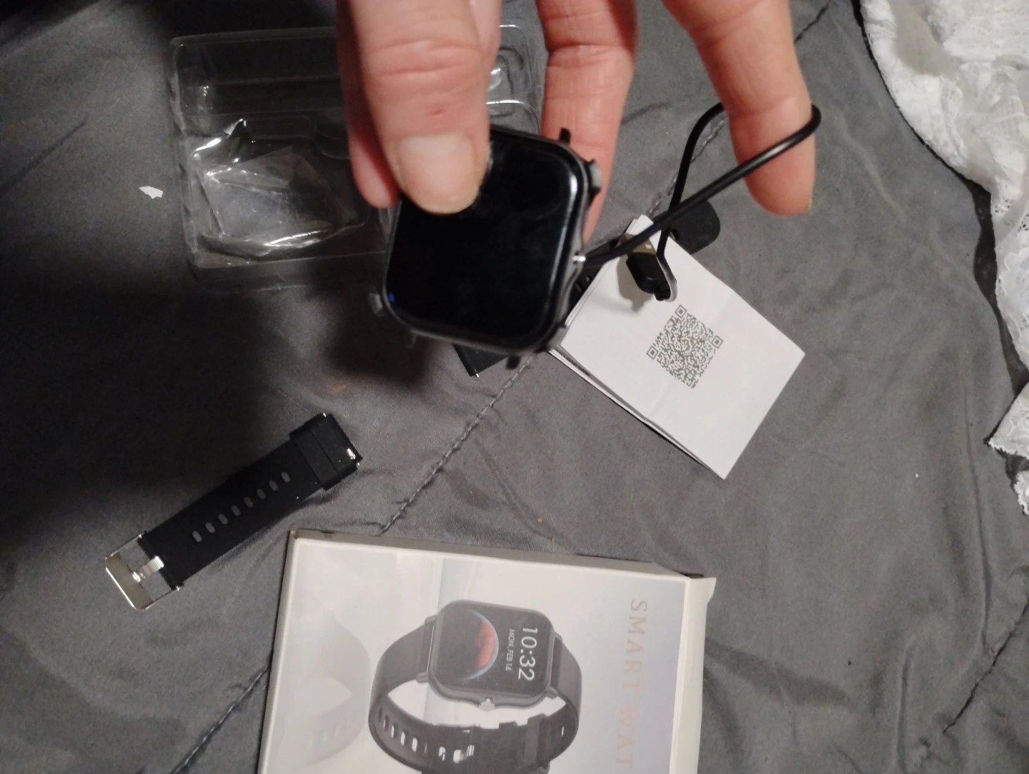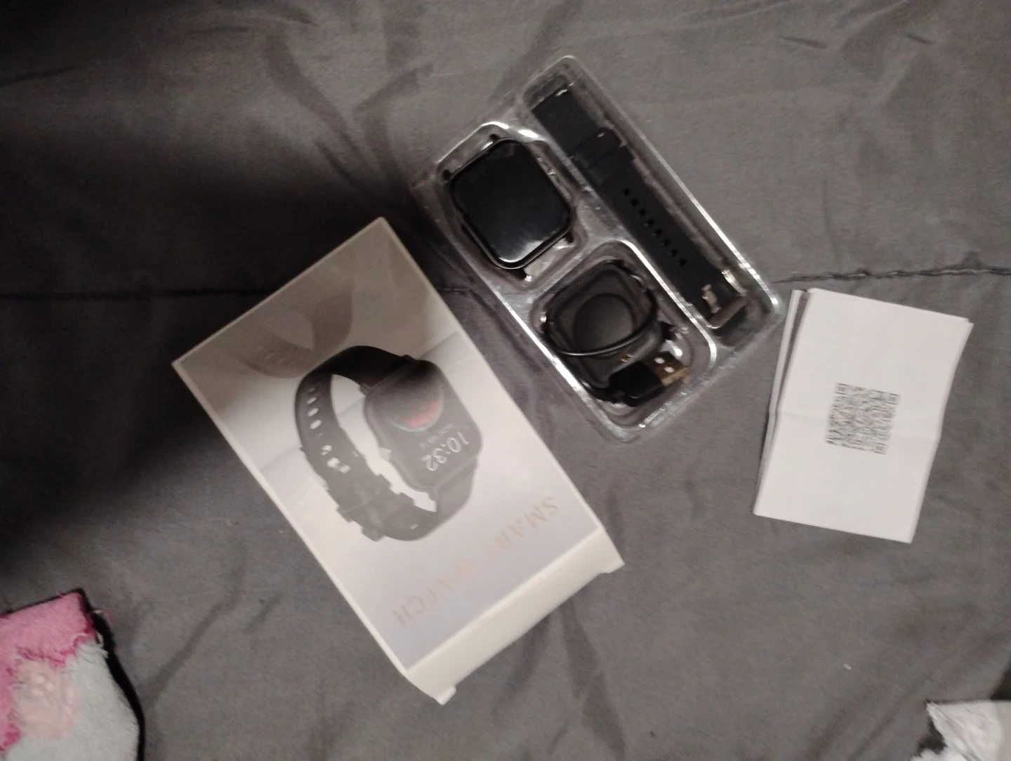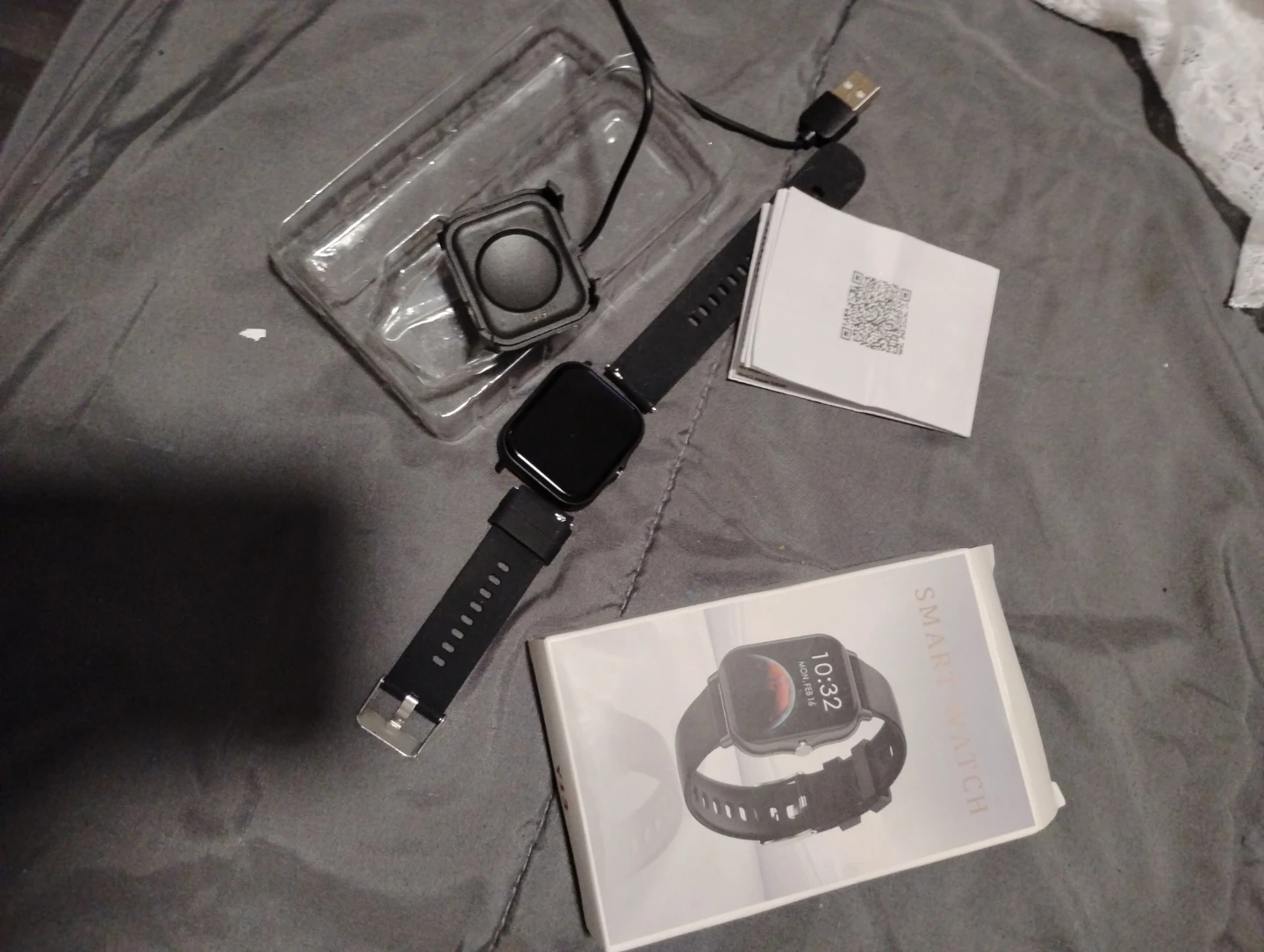 This smart watch comes with a charging cable and instruction manual. It's in its original packaging. This device is great for tracking your daily activity.