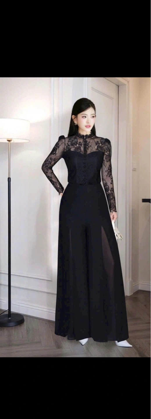 Elegant black lace jumpsuit. It features a high neckline and long sleeves with delicate lace detailing. The wide-leg pants have a chic slit design. Perfect for evening wear!