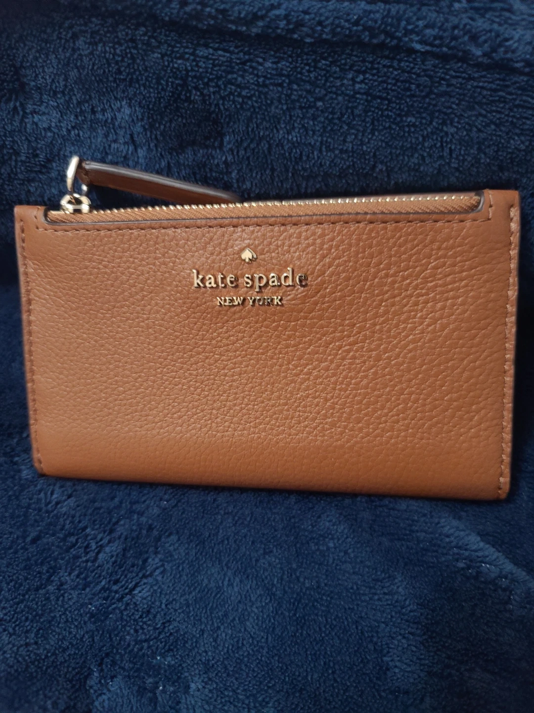 This Kate Spade wallet is made from pebbled brown leather. It features a zip-around closure and multiple card slots inside, plus an ID window. It's a compact size for everyday use!