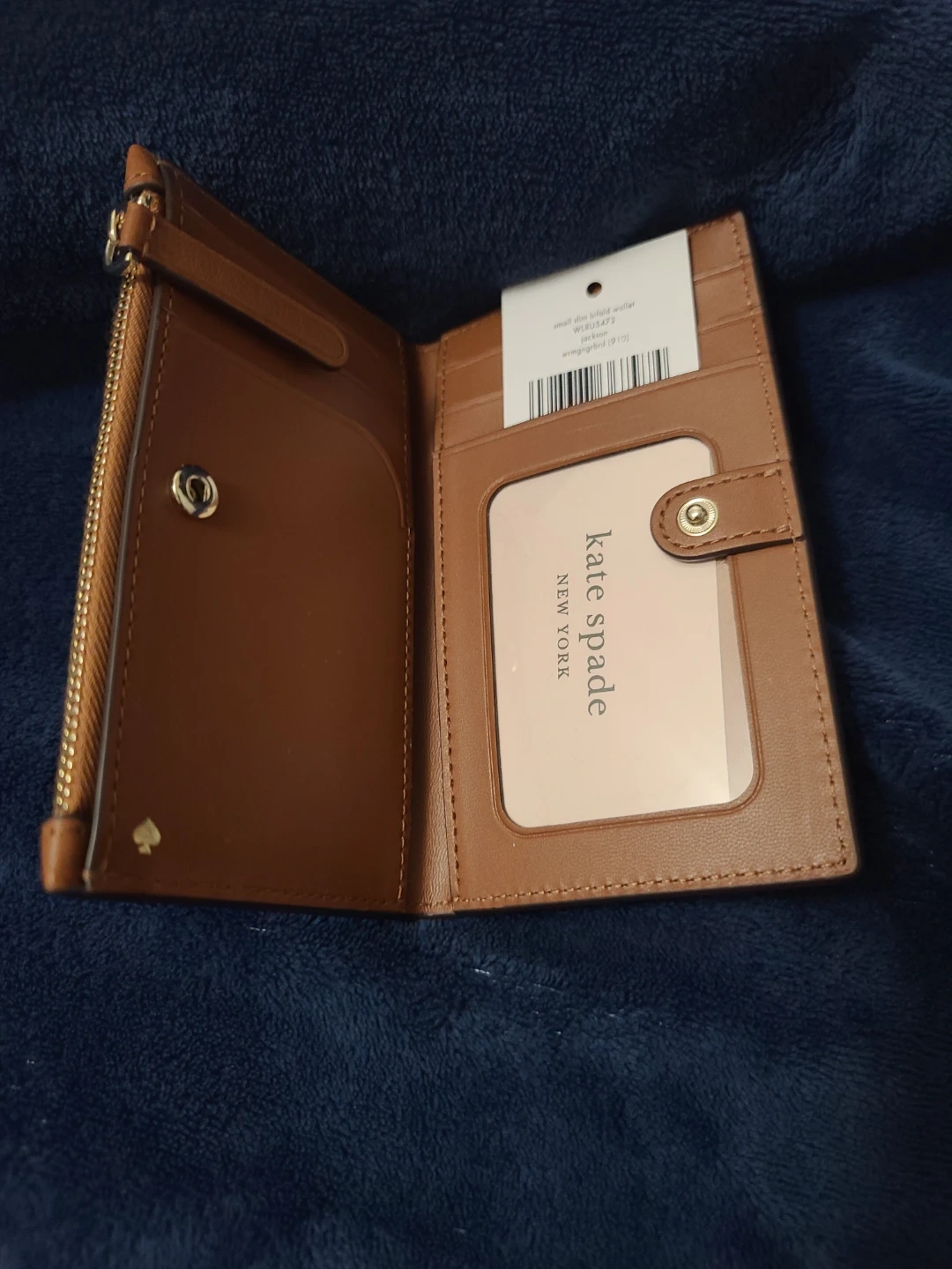 This Kate Spade wallet is made from pebbled brown leather. It features a zip-around closure and multiple card slots inside, plus an ID window. It's a compact size for everyday use!