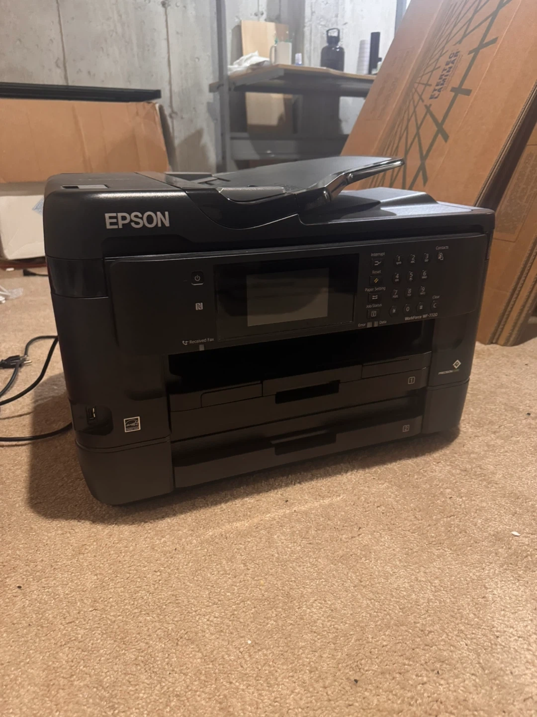 Epson Workforce WF-7720 all-in-one printer. Features wireless connectivity, print, scan, copy, and fax functions. Black and colour.