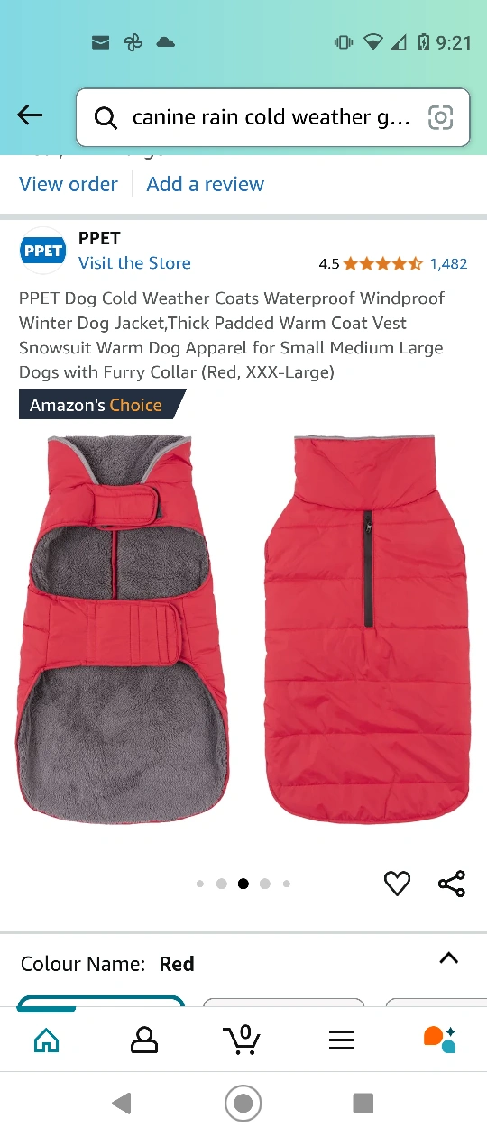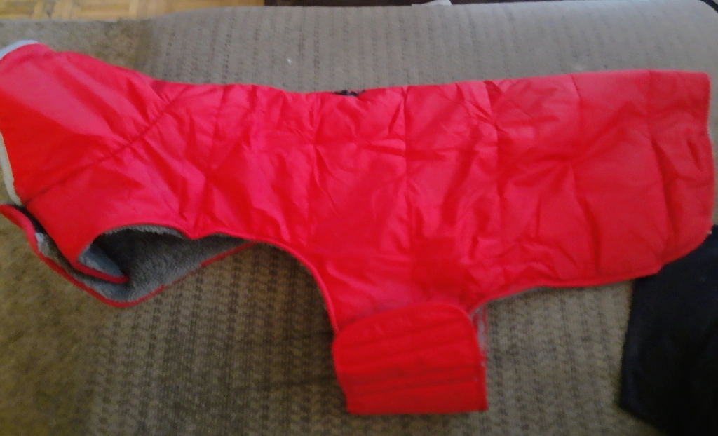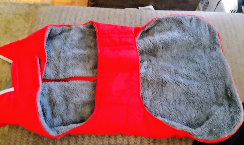 10A 3XL red dog coat with a grey plush interior. Features adjustable straps and a zipper closure. Your furry friend will love this coat during those chilly winter walks.